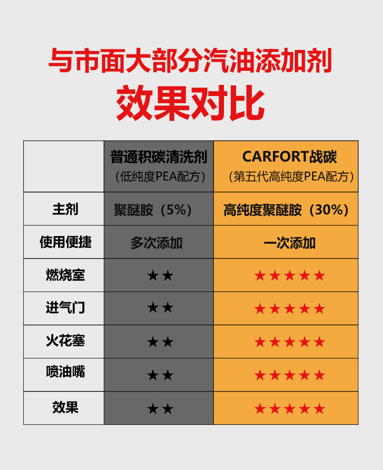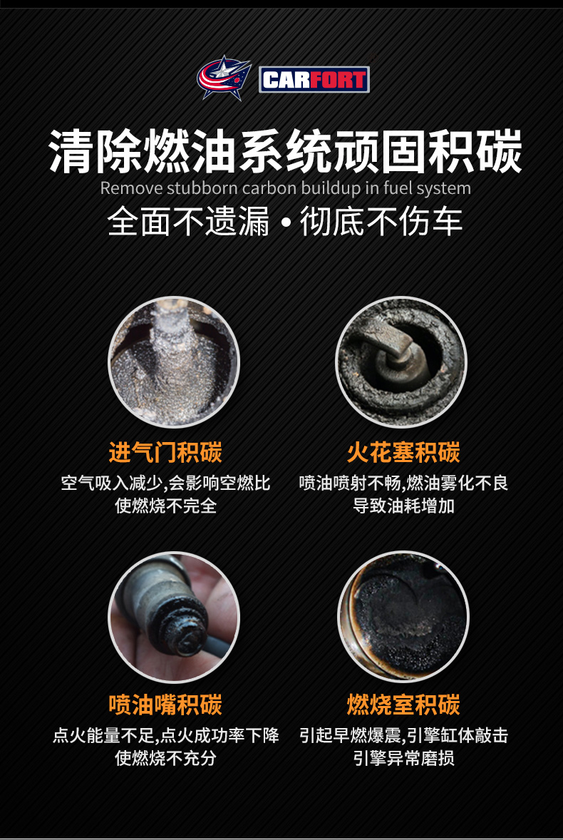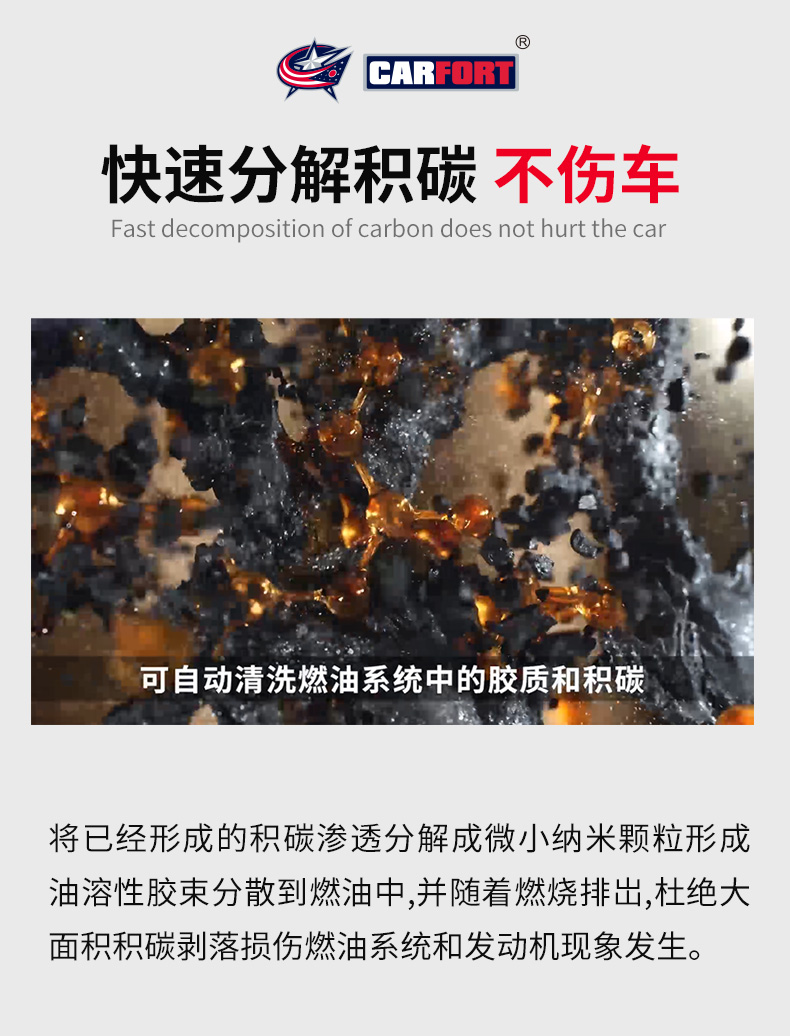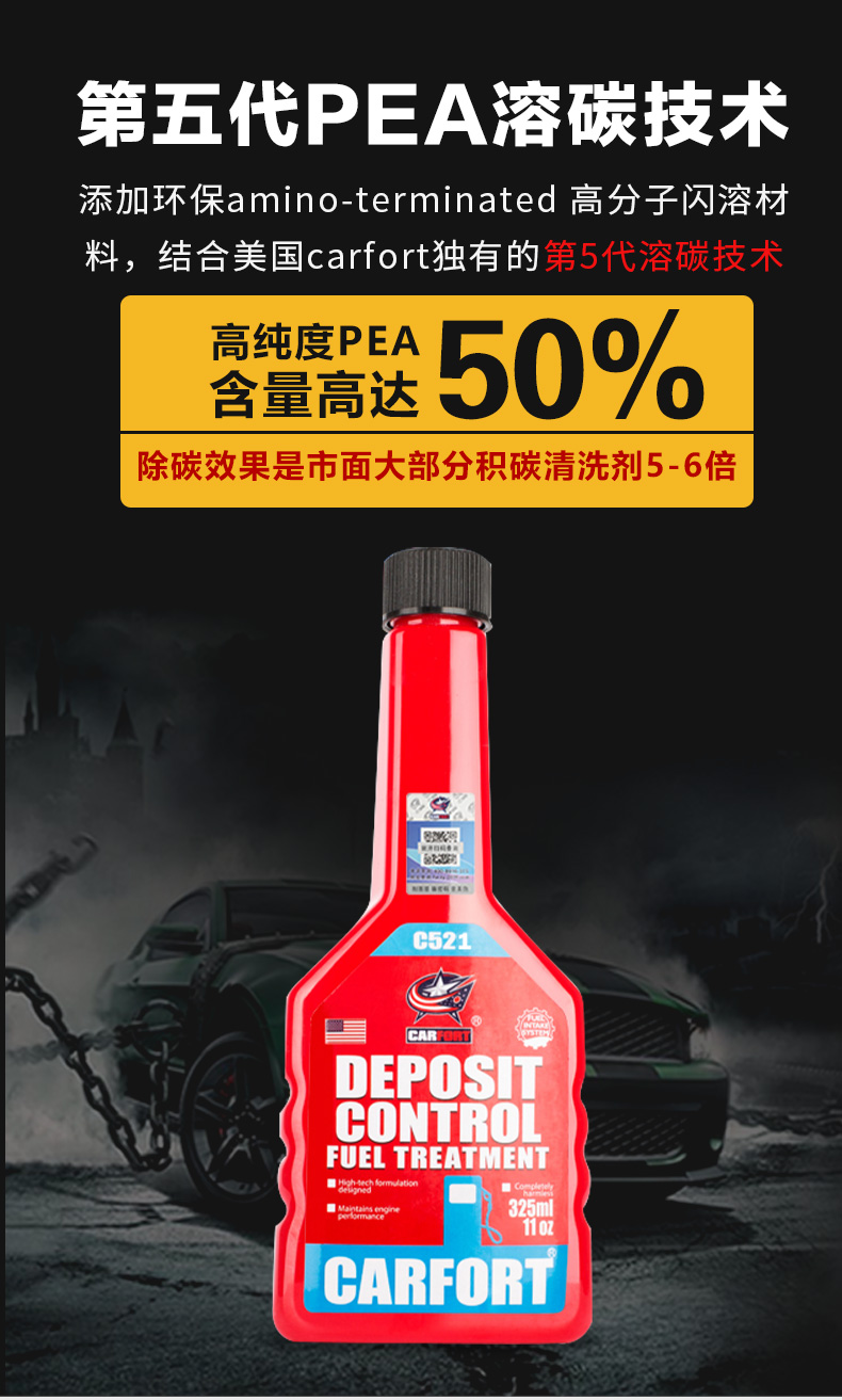 这款Carfort 战碳C521 燃油宝325mL,美国原装进口,经SGS国际权威认证,添加环保amino-terminated高分子闪溶材料,结合美国Carfort独有的第5代PEA溶碳技术,高纯度PEA含量高达50%,喷油嘴+燃烧室+火花塞+进气门全面不遗漏,快速分解积碳及去胶质抑制积碳生成,乳化油箱积水提升燃烧效率,除碳抑碳不伤车,全方位的清洗持久保持燃油系统的清洁。