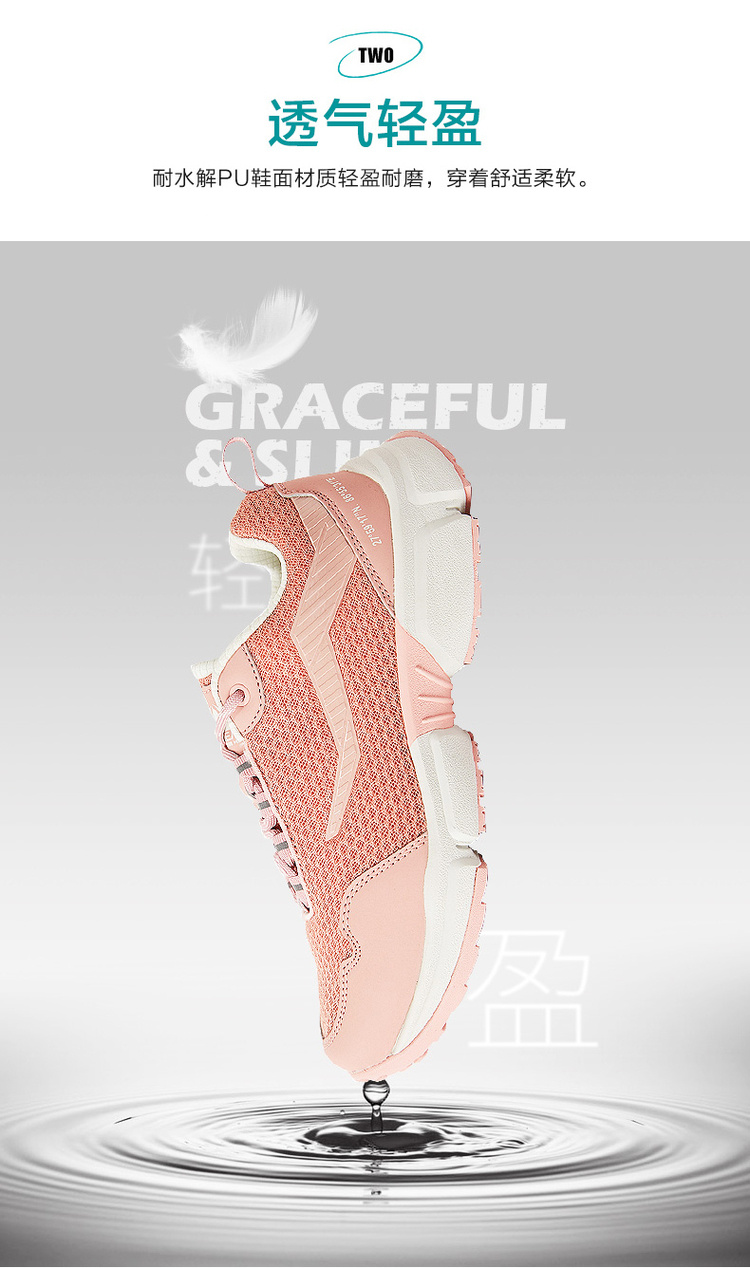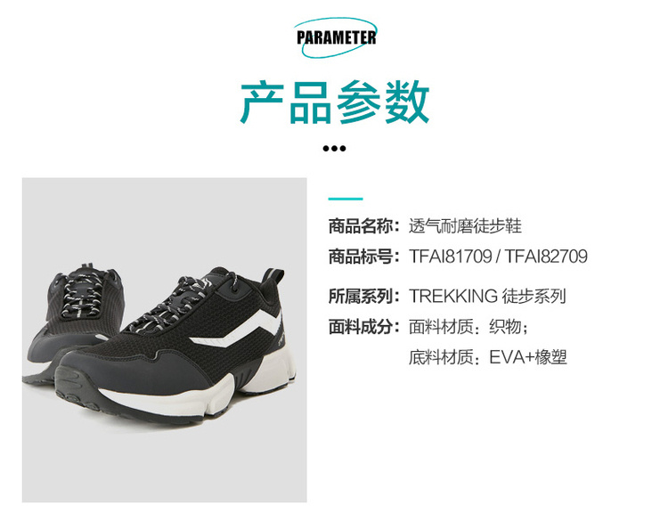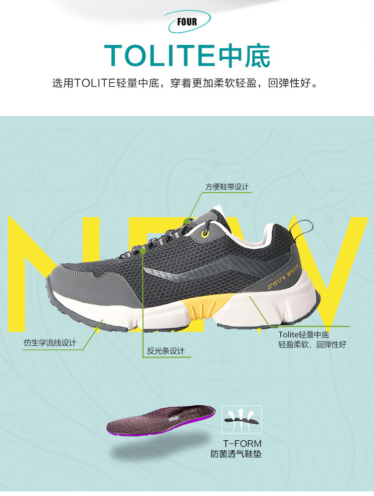 中底为TOLITE轻量级中底,轻量EVA发泡,穿着柔软轻盈,回弹性哈,搭配内里的T-FORM防菌透气鞋垫,使双足长时间保持干爽舒适,大面积的网面鞋面和耐水解PU,稳定双足,舒适透气,持久又耐穿。