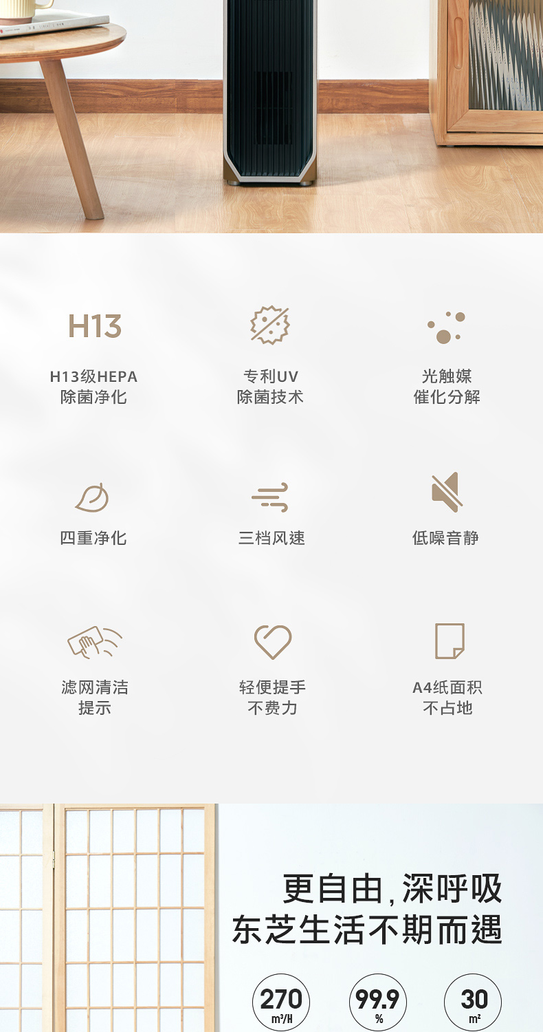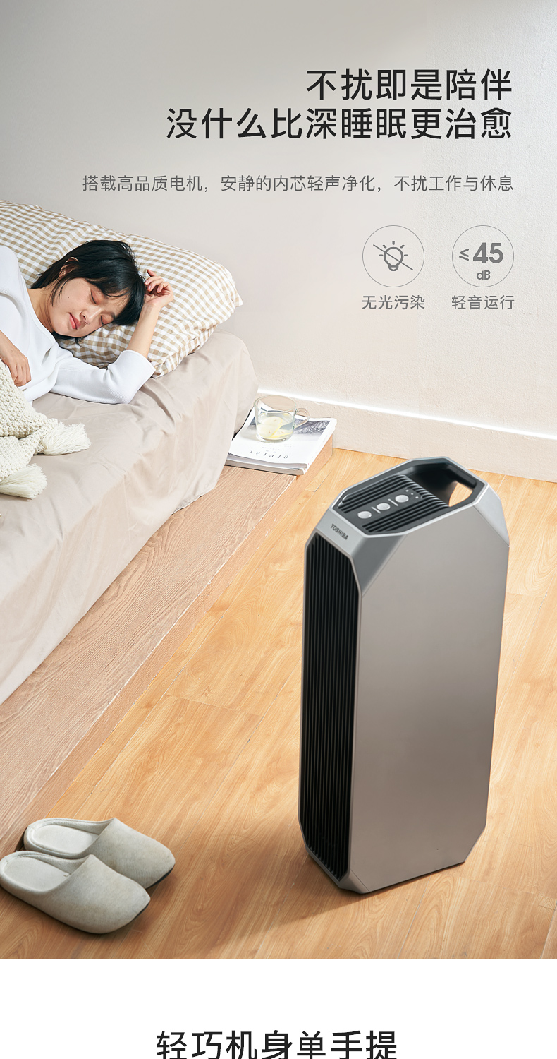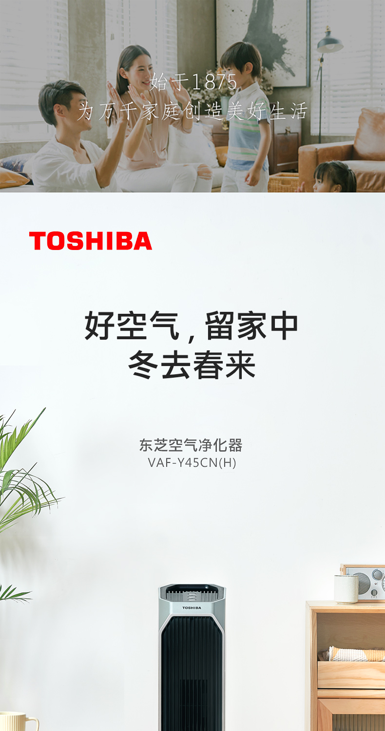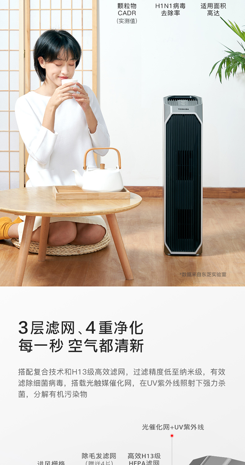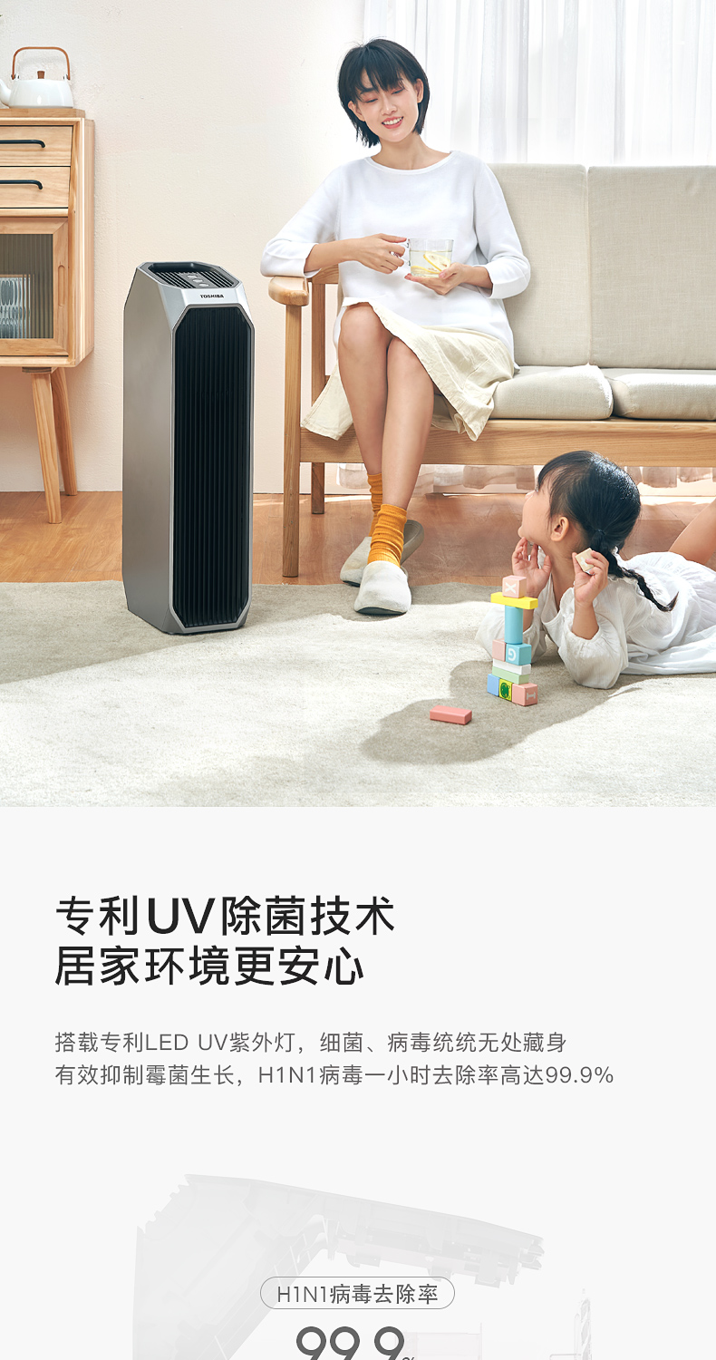 东芝海外同款 CAF-Y45CN(H) 空气净化器!按照欧盟EN1 882标准,对0.3μm粒径微粒过滤效率高于99.97%。