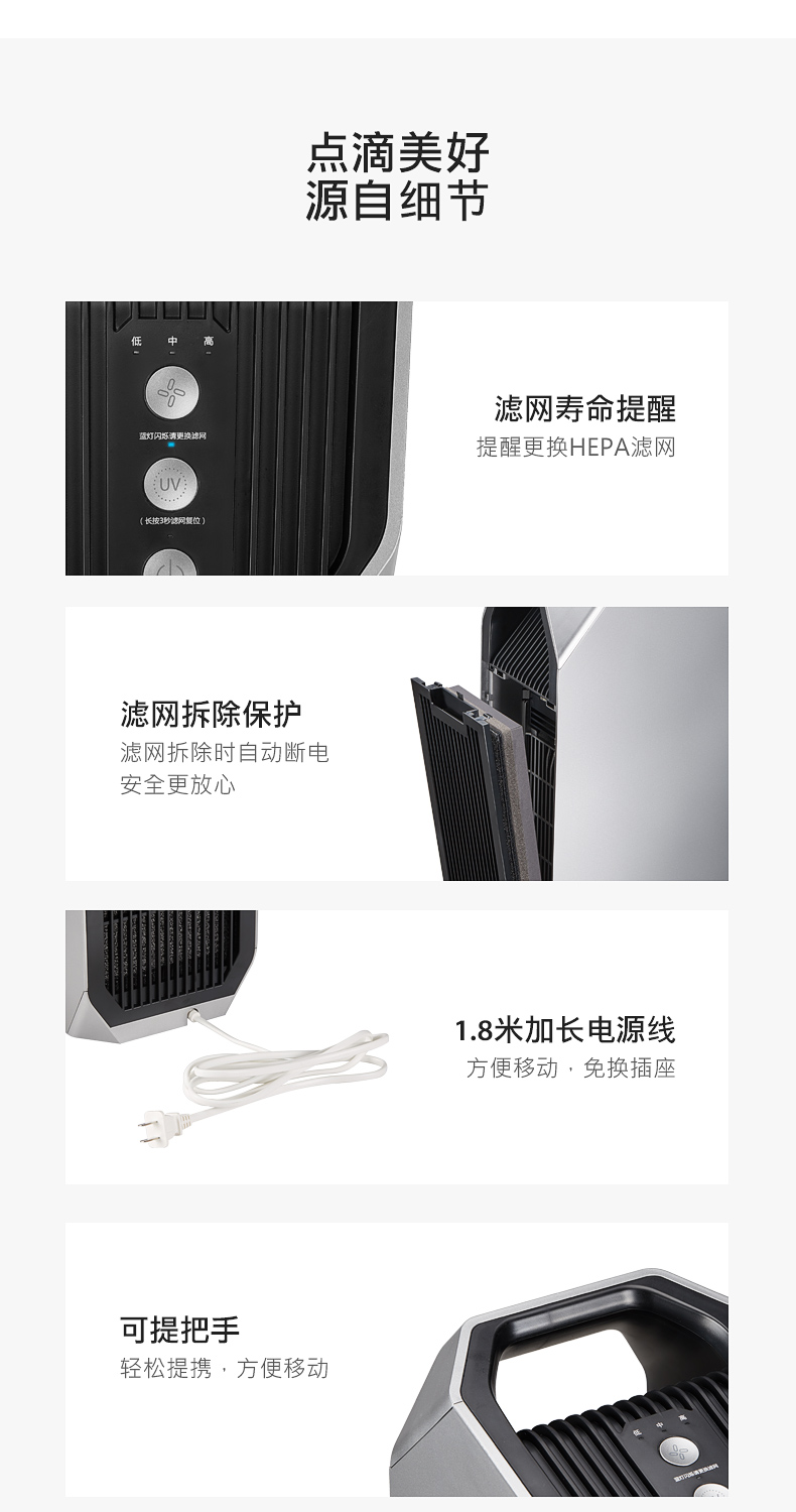 细节上:三档风速一键调控,搭载高品质电机,安静的内芯轻声净化,不扰工作与休息,机身轻巧,净重5.75kg,女生也可轻松领起。带有滤网清洁提示,根据累计运行时间,采用特定的算法计算滤网寿命,使用更换更安心。