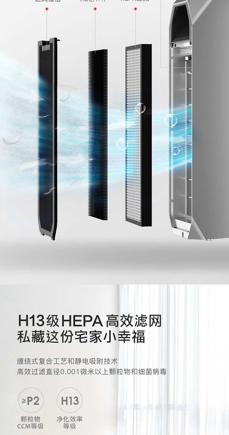 三重滤网,4重净化,其中除毛发滤网赠送4片,核心H13级HEPA高效滤网,缠绕式复合工艺+静电吸附技术,高效过滤直径0.001微米以上颗粒物和细菌病毒。利UV除菌技术,光化媒催化分解,有效降解空气中有毒有害气体,强力杀灭多种细菌,同时释放负氧离子除臭抗污。