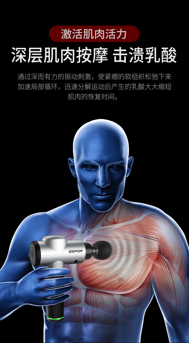 筋膜按摩枪,通过高频振动,以达到缓解长期久坐、剧烈运动所导致的身体酸痛、缓解肌肉紧绷的功效,适用于日常生活中肌肉酸痛僵硬,快速激活肌肉组织,促进血液淋巴回流。