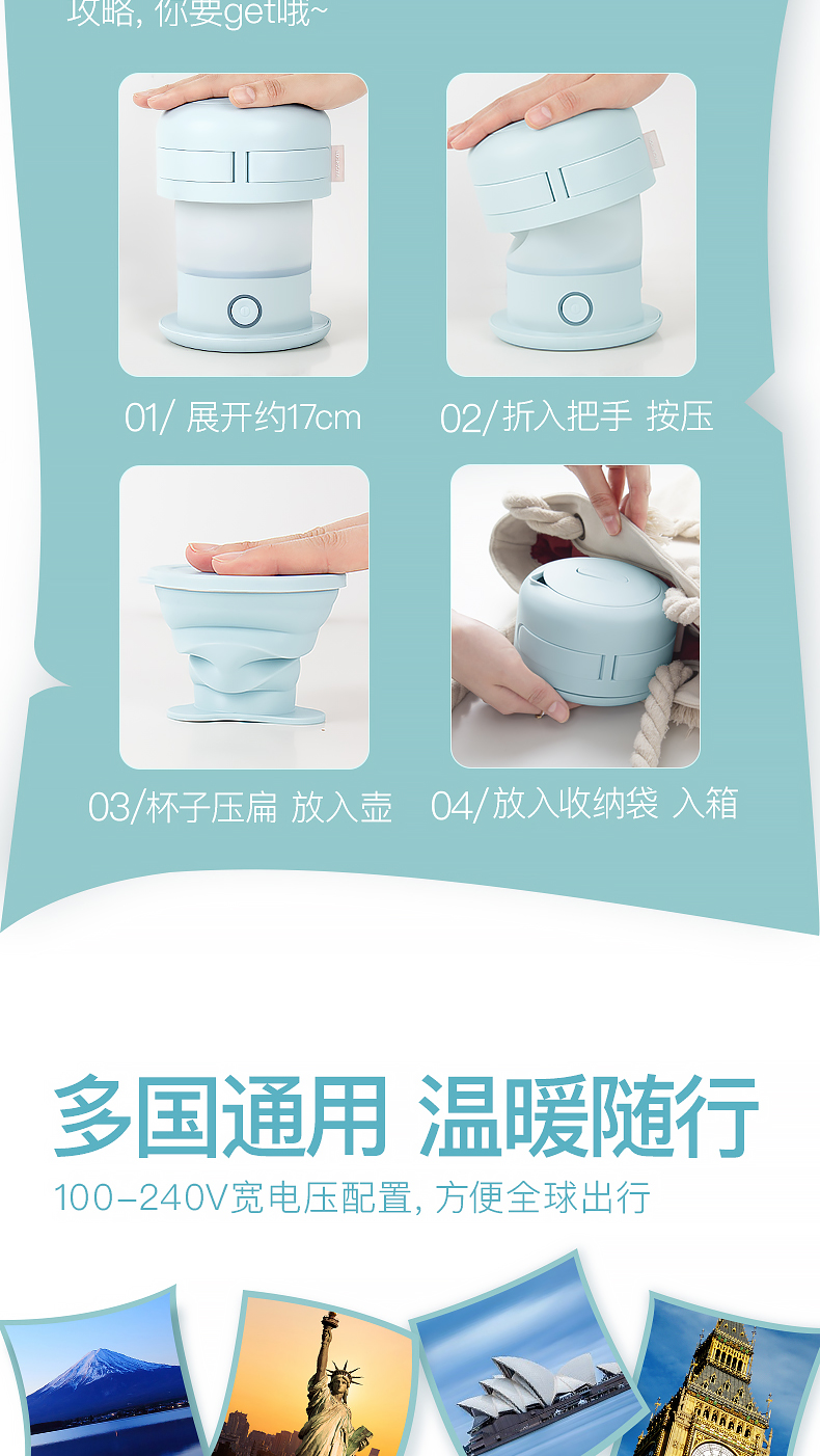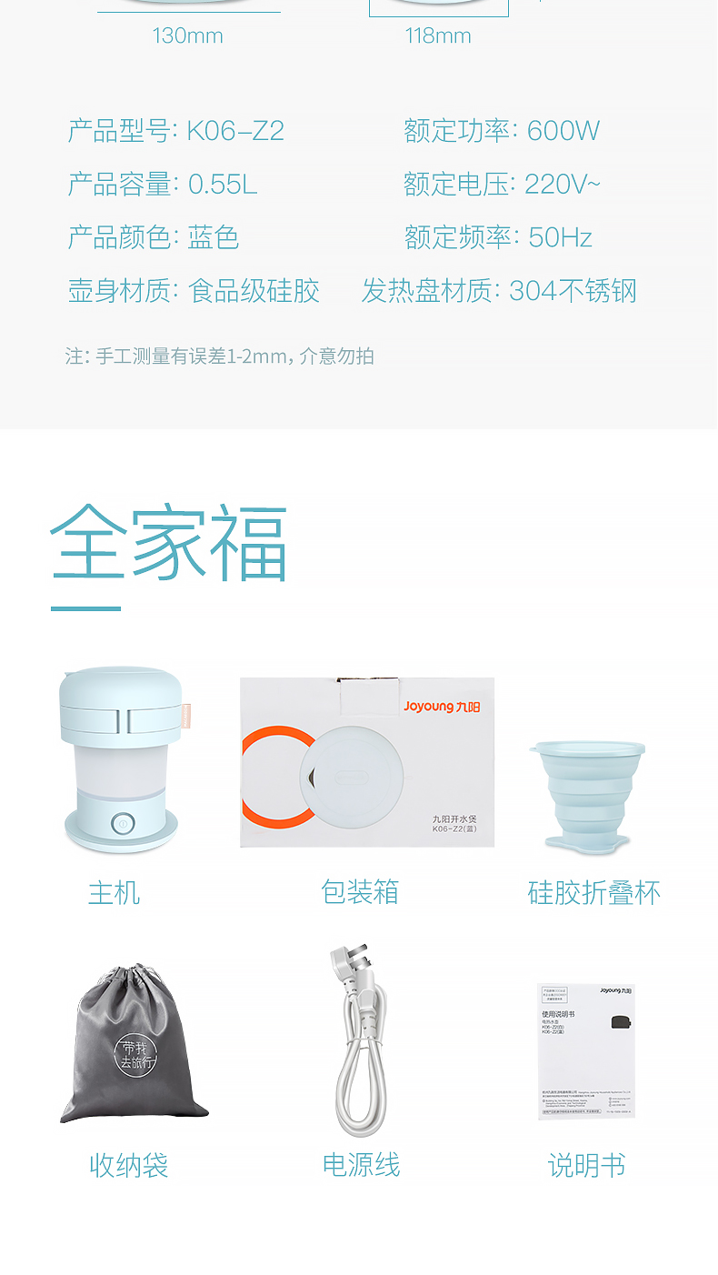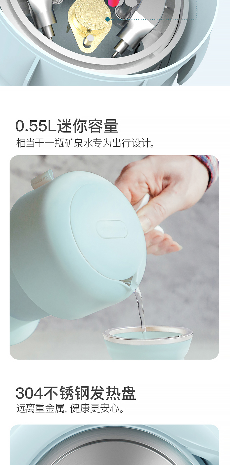 这款Joyoung 九阳便携式折叠电热水壶,婴儿食品级硅胶材质壶身,可耐200℃高温,可折叠设计,压缩后高约75mm,不含双酚A,复合国家认证标准,奥氏体304不锈钢壶底及壶盖,沸腾后自动断电,灯环熄灭,使用安心,550ml迷你容量,相当于1瓶矿泉水水量,宽电压110~240V都可使用,出国旅行更省心,搭配有收纳袋,超贴心超方便。