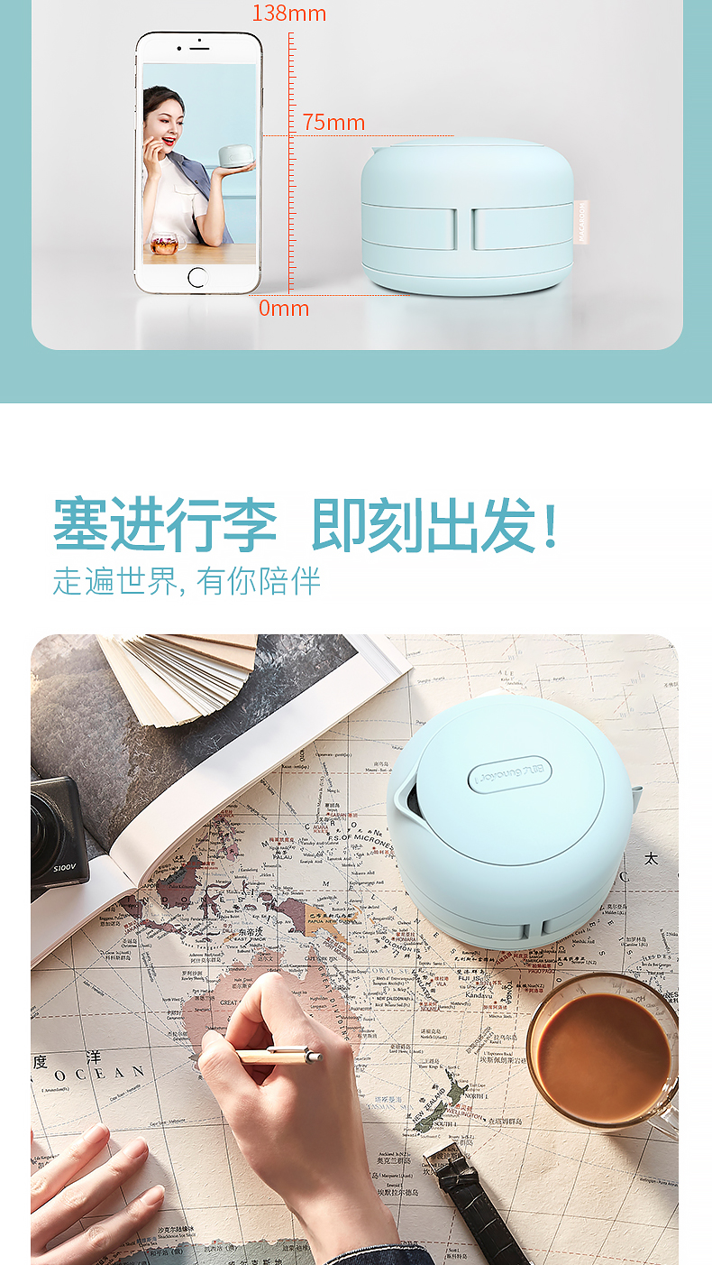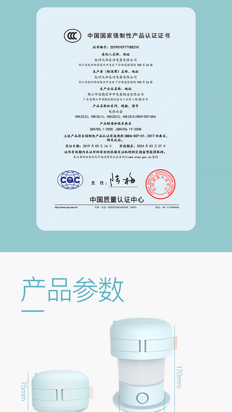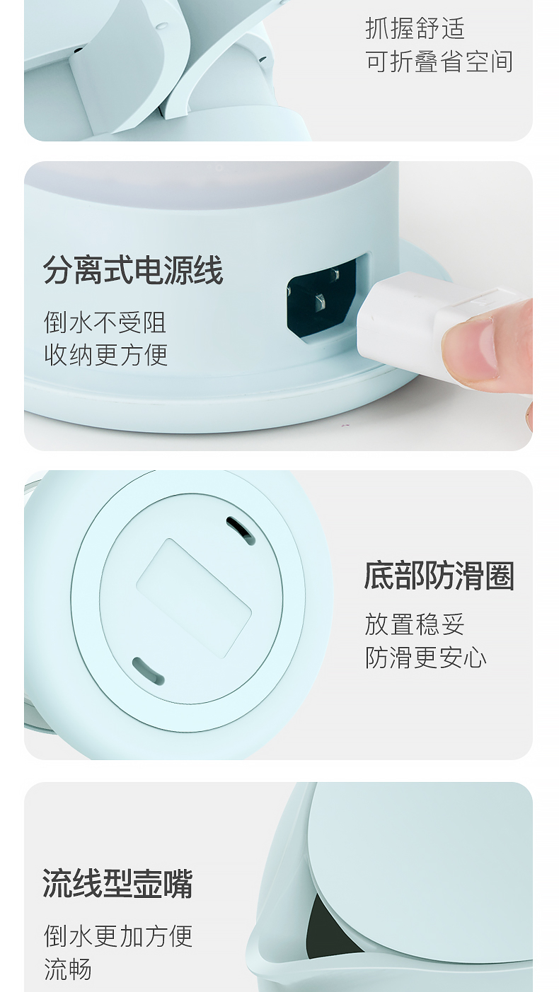 这款Joyoung 九阳便携式折叠电热水壶,婴儿食品级硅胶材质壶身,可耐200℃高温,可折叠设计,压缩后高约75mm,不含双酚A,复合国家认证标准,奥氏体304不锈钢壶底及壶盖,沸腾后自动断电,灯环熄灭,使用安心,550ml迷你容量,相当于1瓶矿泉水水量,宽电压110~240V都可使用,出国旅行更省心,搭配有收纳袋,超贴心超方便。