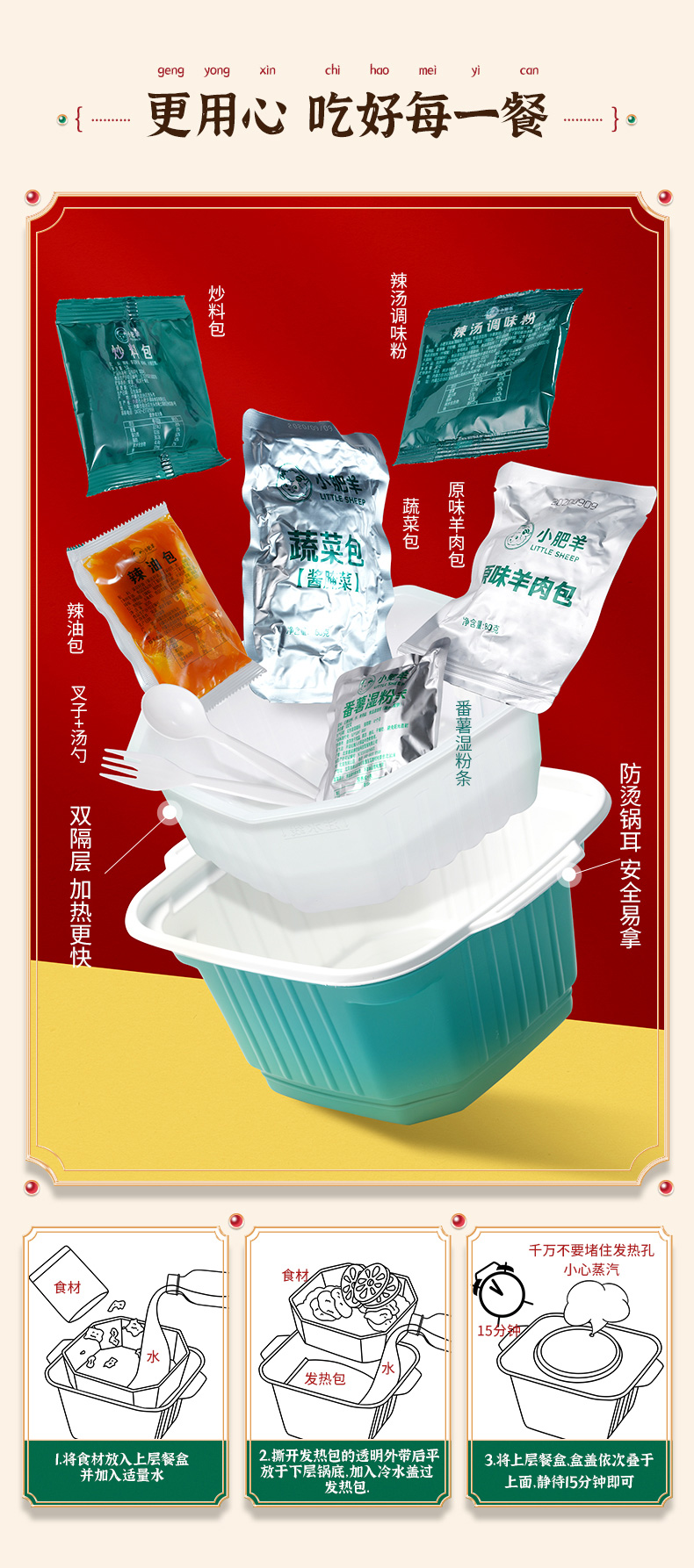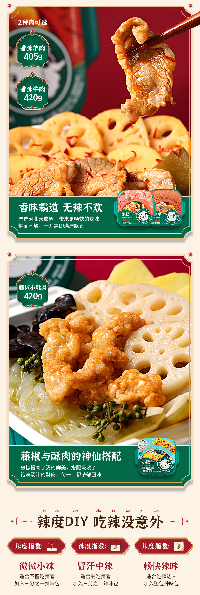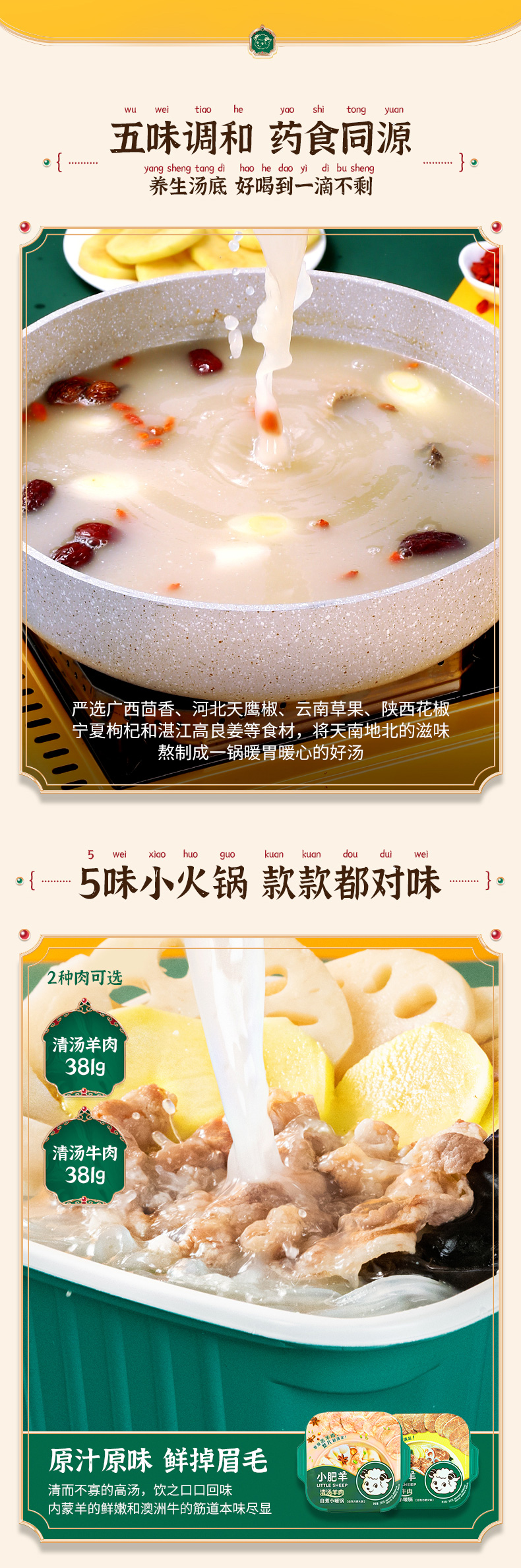 甄选内蒙6月龄羔羊肉/澳洲原切牛肉、足量80g。肉质细腻幼嫩、久涮不老,味甘而不腻、性温而不燥,搭配土豆、海带、莲藕、木耳、红薯粉,分量足超过瘾。