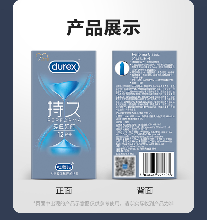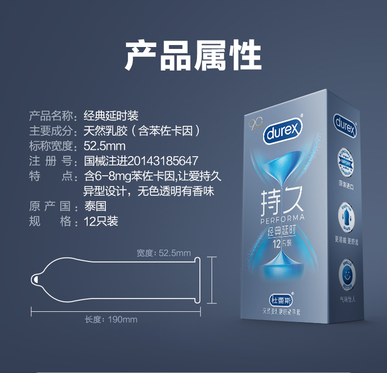 杜蕾斯 持久超薄避孕套,采用天然乳胶制成,产品如丝般轻柔,超薄超滑更敏感,含6-8mg的苯佐卡因成分,有很好的延时效果,而且不麻木见效快,安心征伐不停歇。苯佐卡因是医学上常用的脱敏成分,能降低男性的敏感程度。