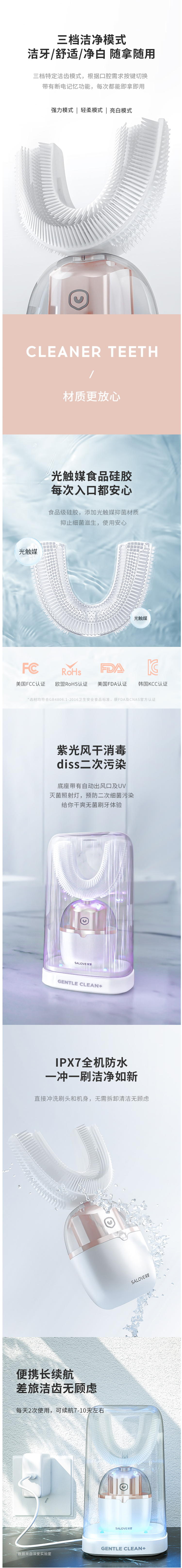 这款深爱 充电式全自动U型电动牙刷,创新U型结构设计,全面贴合牙齿,从里到外深入齿间,洁净牙齿,拥有美国FCC认证、欧盟RoHS认证、美国FDA认证、韩国KCC认证,安全可靠。