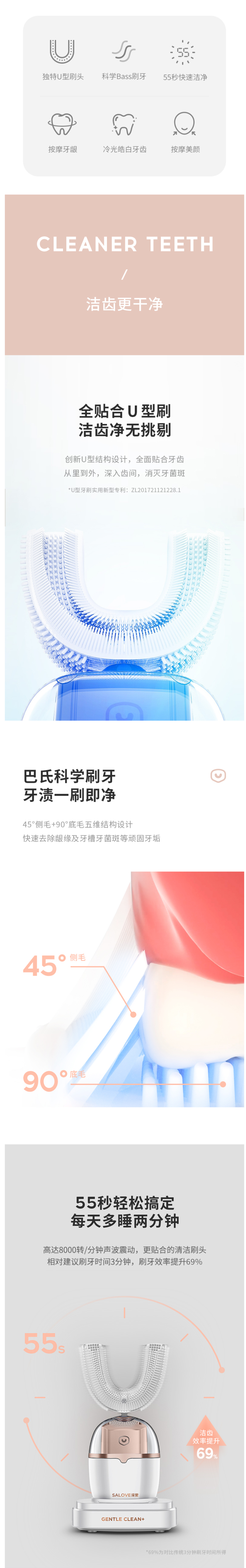 口腔震动按摩功能,达到洁齿美颜二合一的目的。刷头外侧震动按摩脸部,饱满苹果肌、提升下颚线,塑型美颜。