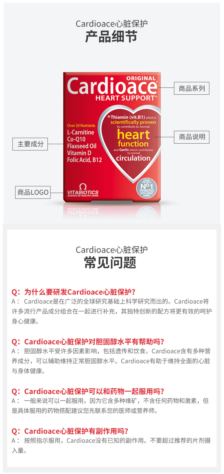这款维百莱旗下Cardioace辅酶Q10,英国原装进口,使用复合配方,全方面呵护心脏。主要成分是辅酶Q10、植物亚麻籽油、大蒜素、镁、硫胺素、维生素B6、维生素B12、叶酸等22种营养元素,除了呵护心脏,同时呵护全身健康。