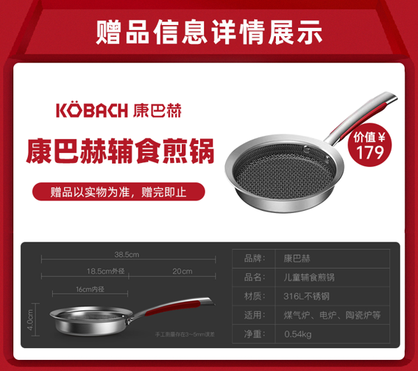 天猫康巴赫宝翰专卖店499元,可领200元优惠券,实付299元到手,还送价值179元的康巴赫辅食煎锅。