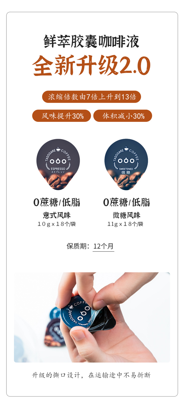日本原装进口,全新升级,由原来的7倍浓缩升级到13倍浓缩,风味提升30%、体积缩小30%,日本鲜萃工艺,8小时低温萃取,氮气充氮保鲜,残氧量低于1%,完美的保留了咖啡的风味和香气。可直接用冷热水/牛奶冲泡,口感媲美现磨咖啡,胶囊便携,随时随地都可享受。