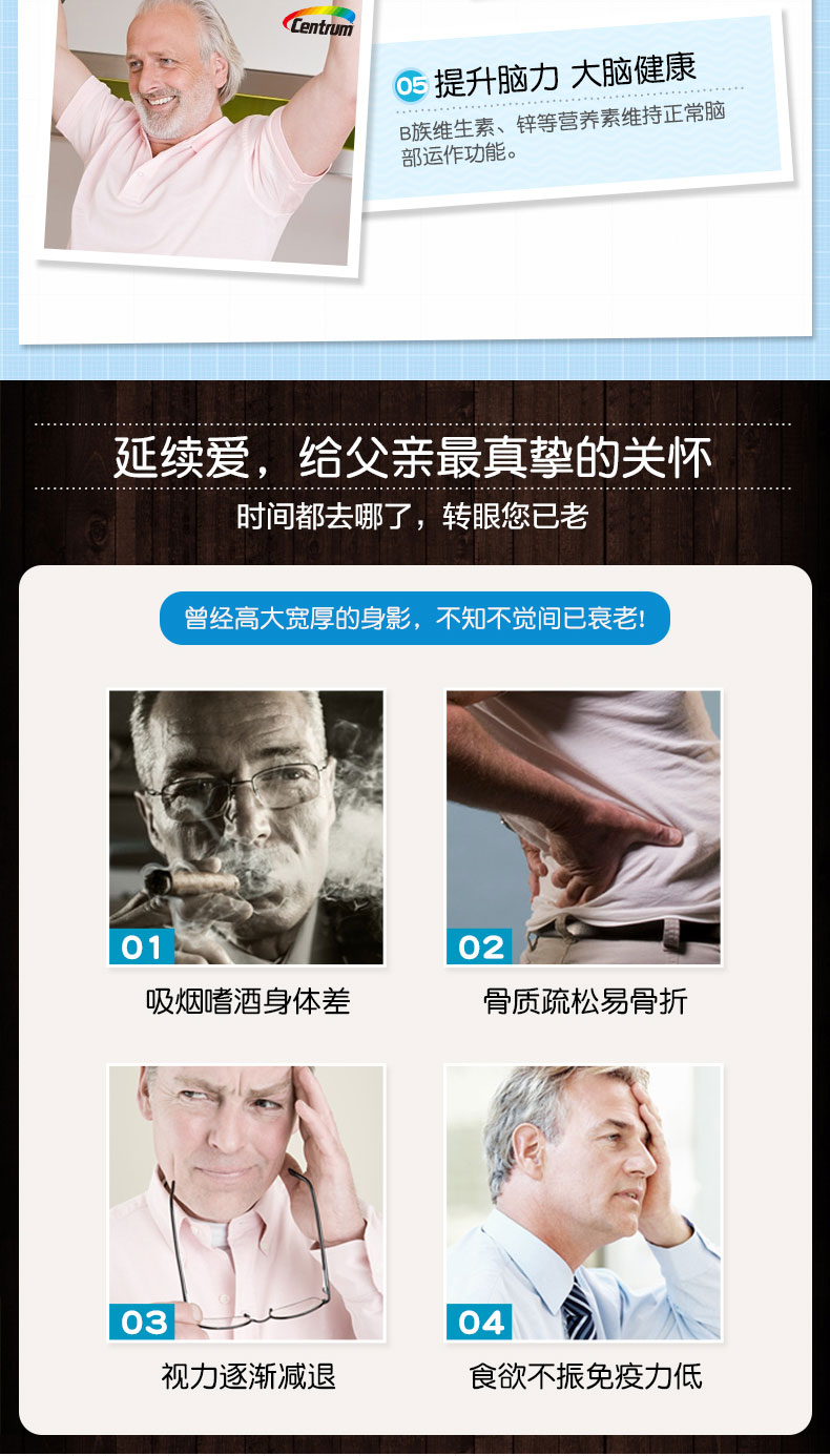功效:维护心脑血管健康,增强骨骼肌肉能力、促进代谢,提高免疫力,其中番茄红素可以补充心脏所需营养,保护心血管健康,叶黄素+维生素A 可帮助维持正常视力保护眼睛健康,适合经常吸烟酗酒、骨质酥松、视力逐渐减退,食欲不振免疫力低下中老年男士。