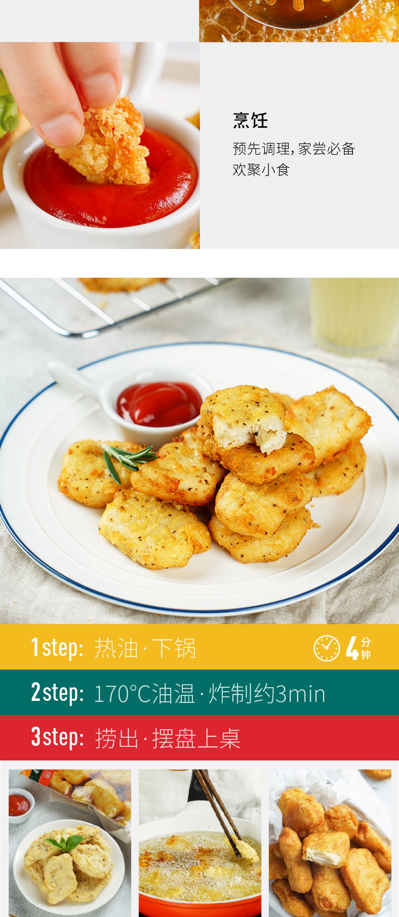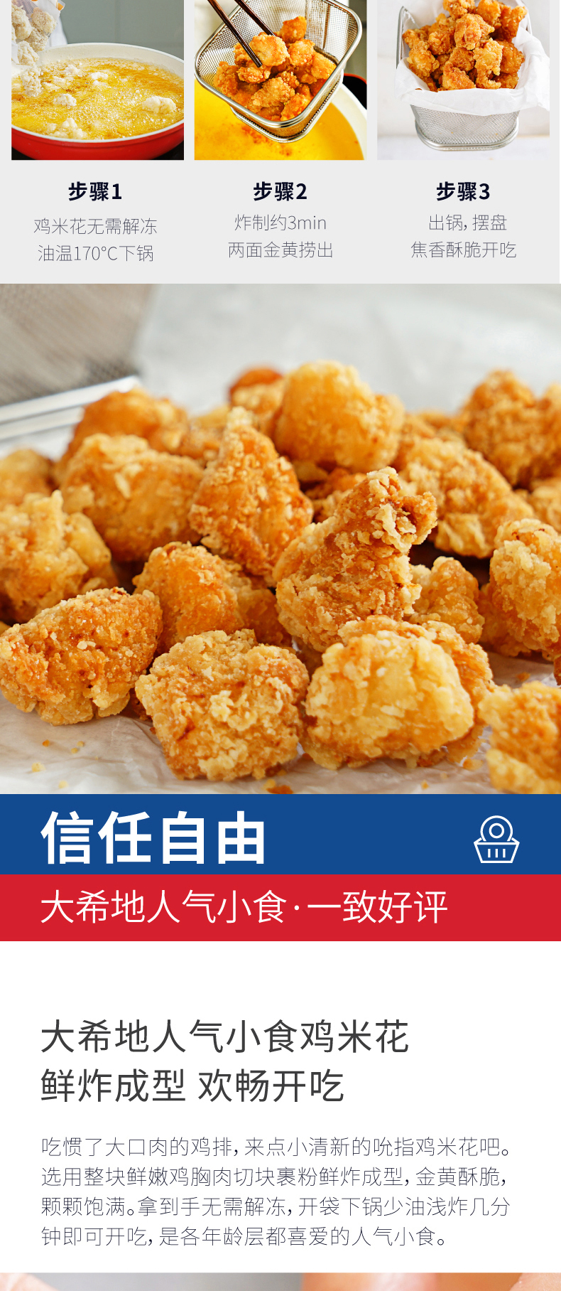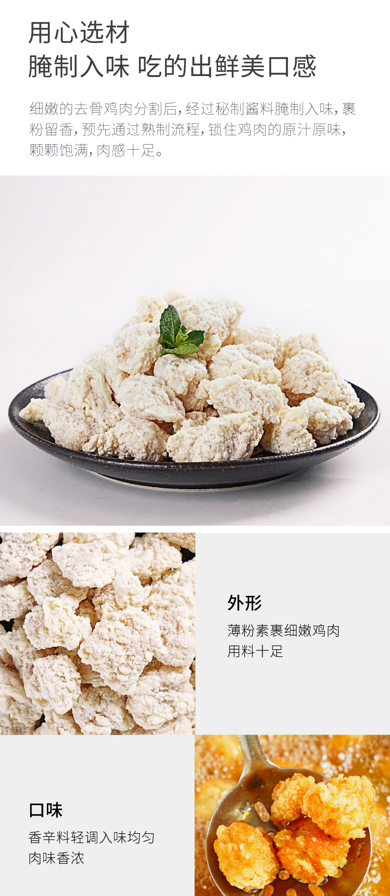精选自有农场生态养殖鸡胸肉,鸡肉细腻,口感不柴;并经过秘制酱料腌制入味,鸡米花金黄酥脆,颗颗饱满,下过油三分钟即可食用,制作简单方便。