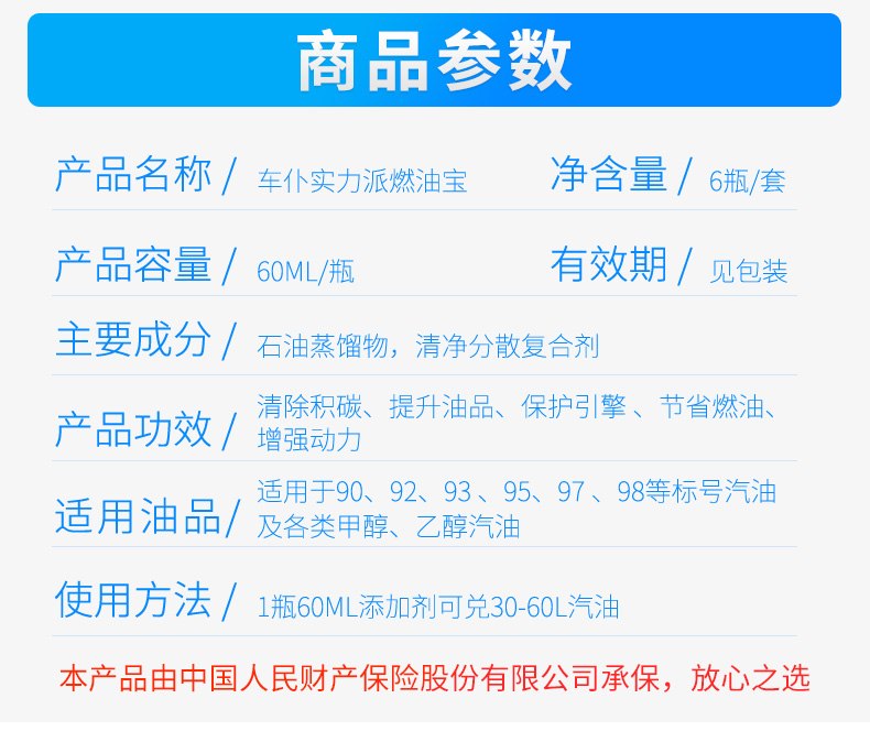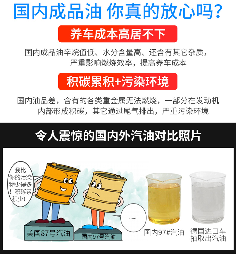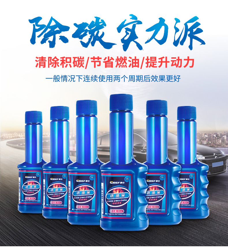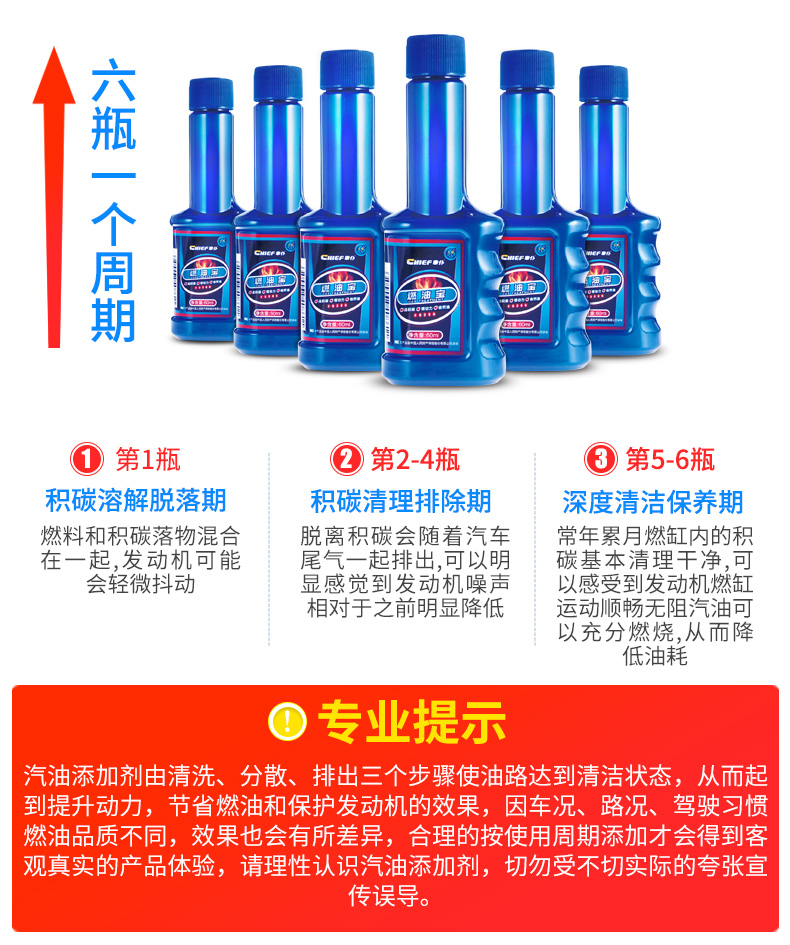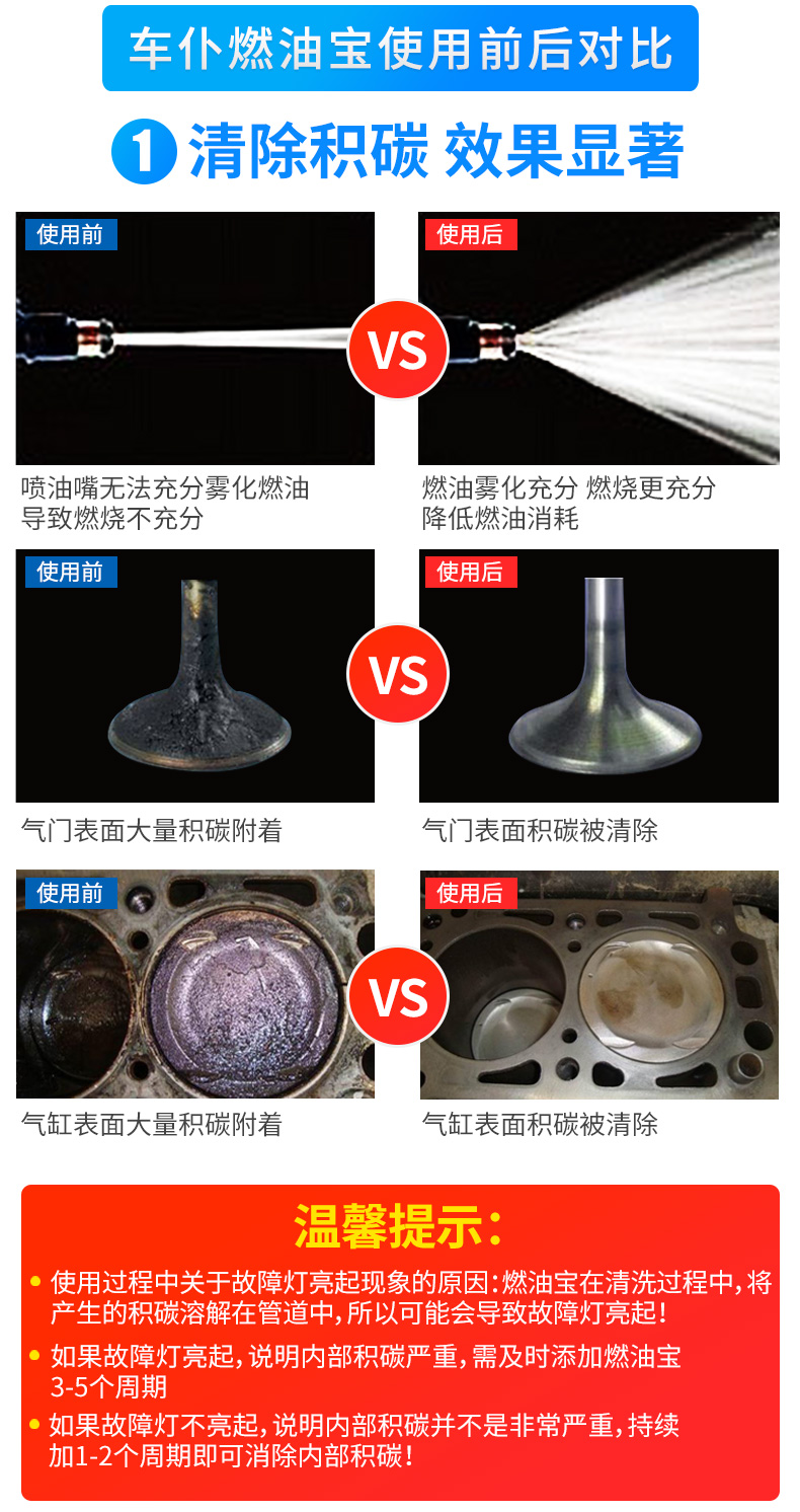商品内增加了清洁分散剂和助燃剂;清洁分散剂能够快速融入积碳内部,实现分解清洁功能,并且将已分解的积碳分散于汽油中一同燃烧;助燃剂可以促进积碳和水分能够充分燃烧,并且提高发动机效率,保持强劲动力。