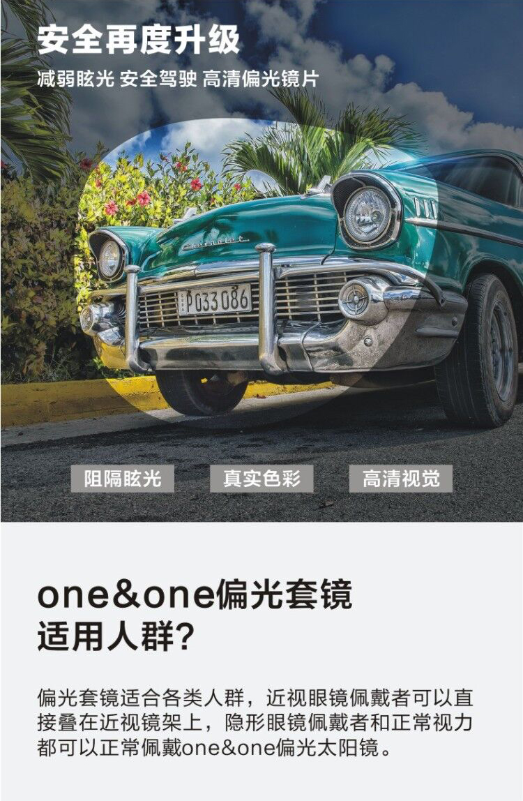 one&one的偏光套镜让近视人群可以轻松享受阳光视觉,解决近视人群的视觉烦恼。在线下占据近视太阳镜绝大部分的市场,是近视人群不可或缺的功能产品。