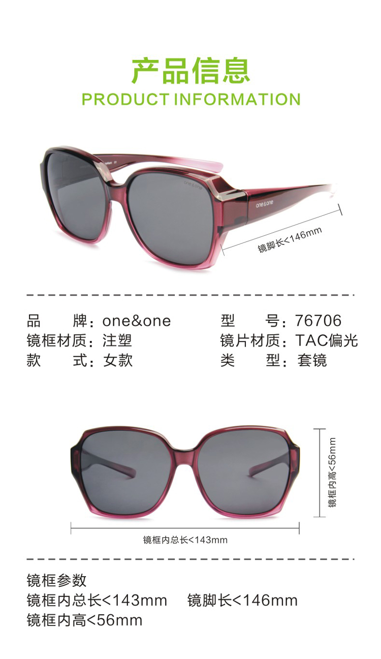 这款oneone 女偏光太阳镜是套镜,近视眼镜佩戴者可以直接套在近视的光学镜架上,对于近视的朋友来说非常友好。如果是隐形眼镜佩戴者或正常视力都可以直接佩戴,适合各类人群。