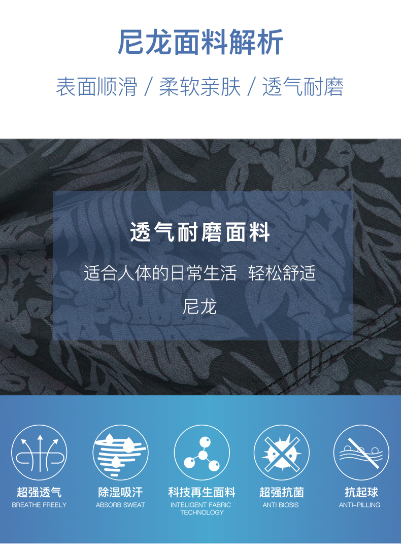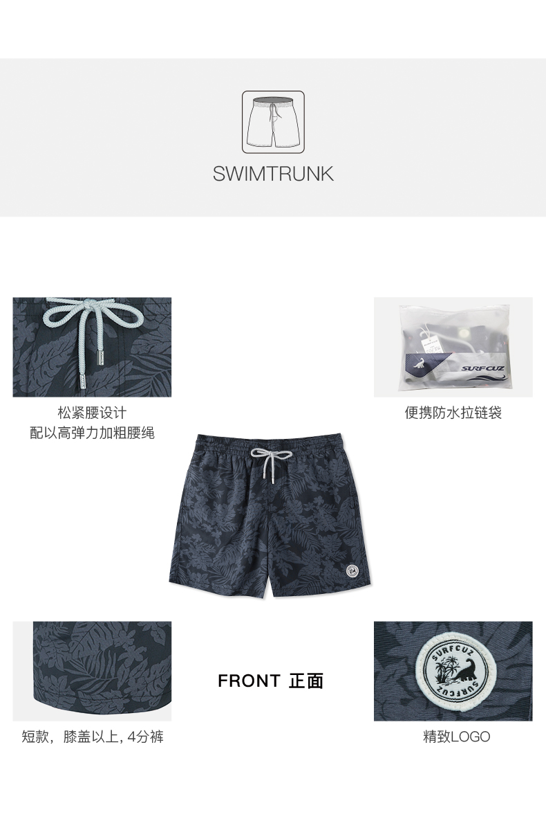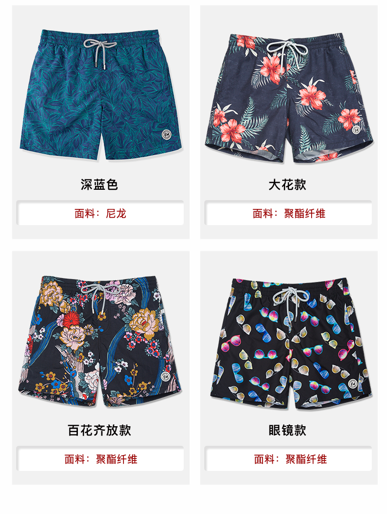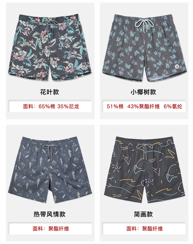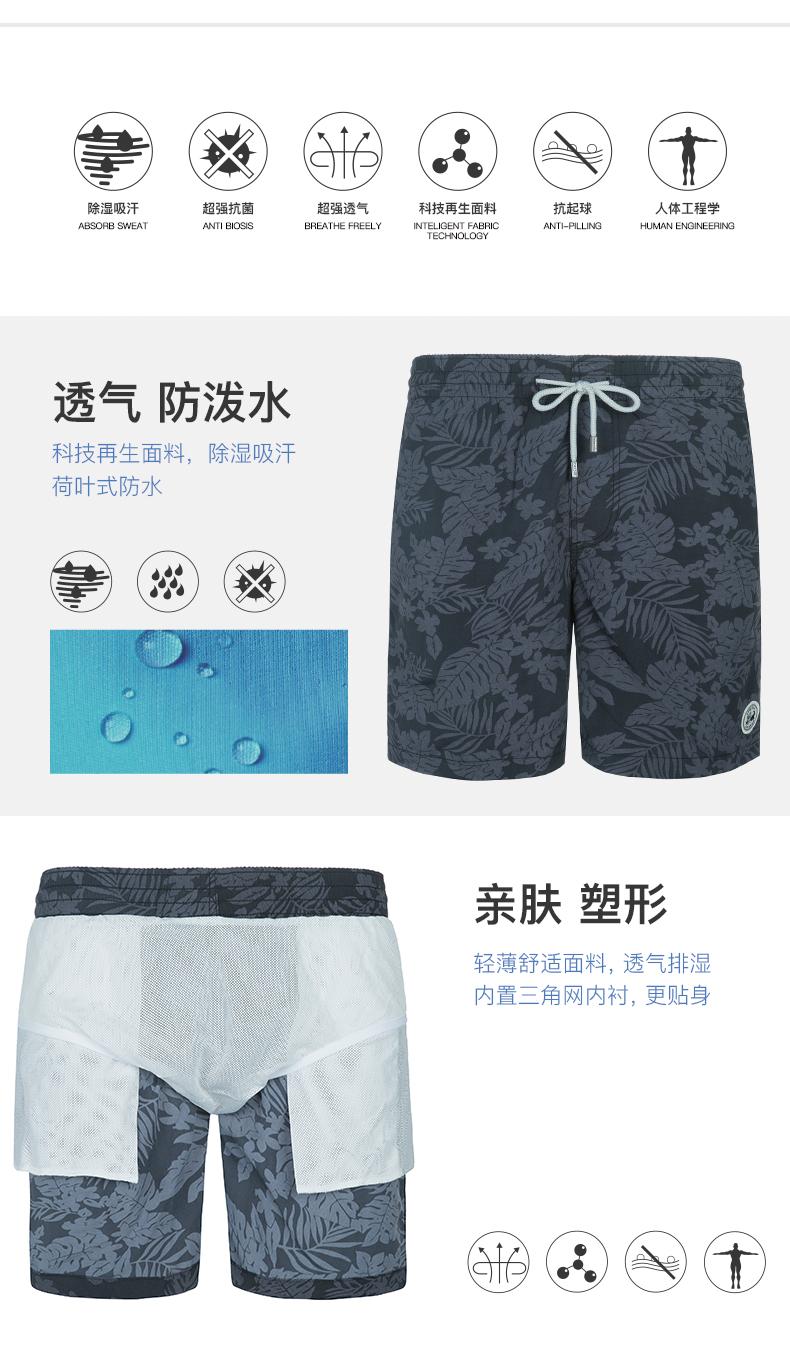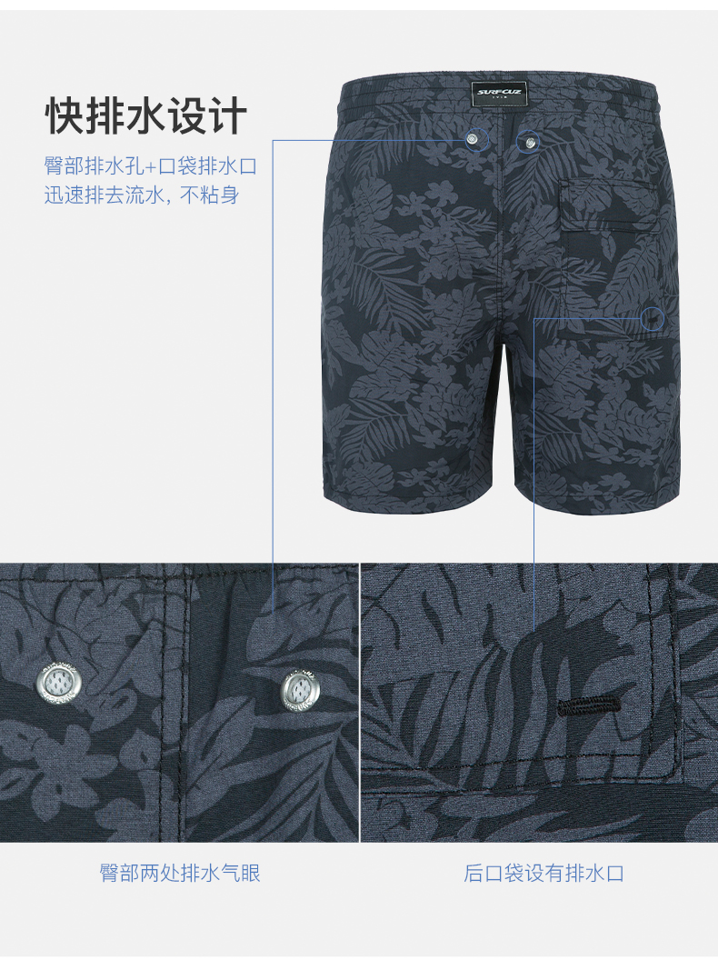 这款短裤是四分裤造型,裤腿在膝盖靠上位置,比较清凉。内里带有三角网内衬,防止坐或躺的时候走光。腰带为抽绳松紧设计,不容易勒腰。两侧加后袋,总共三个口袋,方便随身携带物品。短裤印花图案采用活性染料,图案清晰不易褪色。而且短裤在臀部位置和口袋兜底有排水孔,可以直接下水,当泳裤穿。