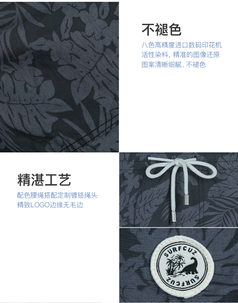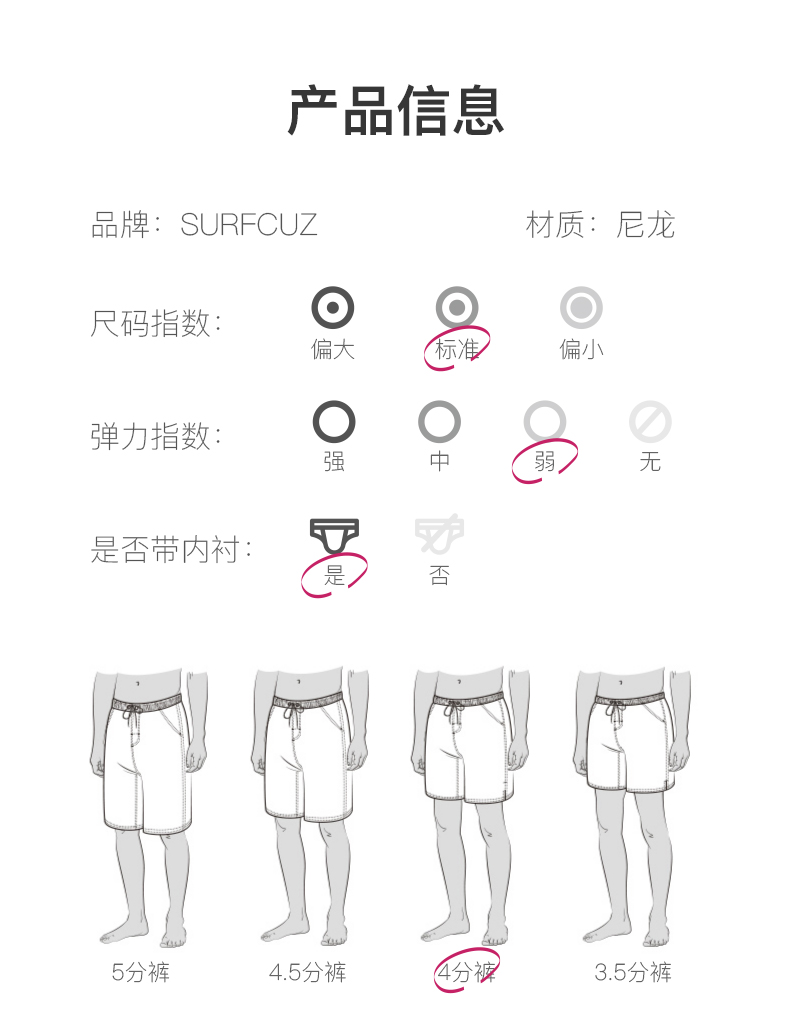 这款surfcuz短裤采用高密度速干面料制成,面料顺滑耐磨,透气性强,并采用荷叶式防水工艺,沾水后迅速滑落。因为是高密度面料,所以也不爱粘沙子,当做沙滩裤穿时,粘的沙子很好拍打掉。就穿着舒适度来说不如大裤衩,不适合休闲穿,比较适合户外运动,或去海边当沙滩裤穿。日常穿的话,要买大一码。