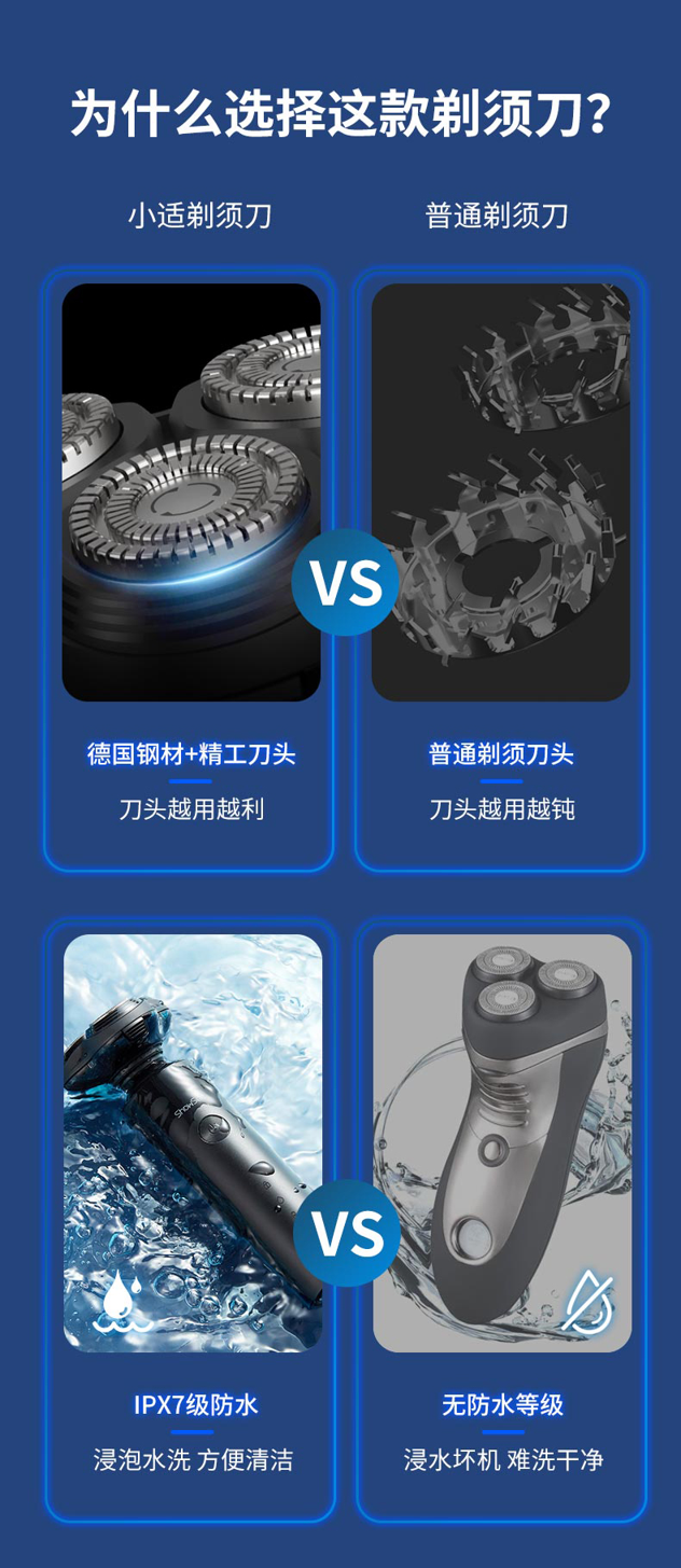 采用独立浮动3刀头设计,弹性贴面全向剃须,双环刀网,灵活浮动,深入死角,德国进口精工钢材,EMC电化学加工工艺处理,自动研磨,锋利持久,IPX7级水洗,干湿双剃,800MAH锂电池,1个半小时充满电,支持90分钟续航。领券链接点此