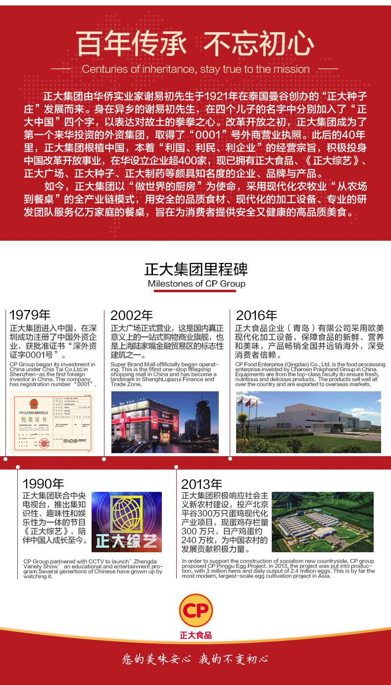 正大食品是正大集团旗下的一个食品品牌,包括鸡鸭猪等生鲜和熟食系列产品。采用荷兰、美国等国家的先进加工设备,保证了食品的新鲜、营养和美味,符合现代生活需要,畅销全国并远销海外市场,深受消费者信赖。国家体育总局训练局运动员专用产品。正大集团旗下一条龙企业生产的“双大”牌、“正大秦皇”牌、“德大”牌鸡肉为中国名牌产品。