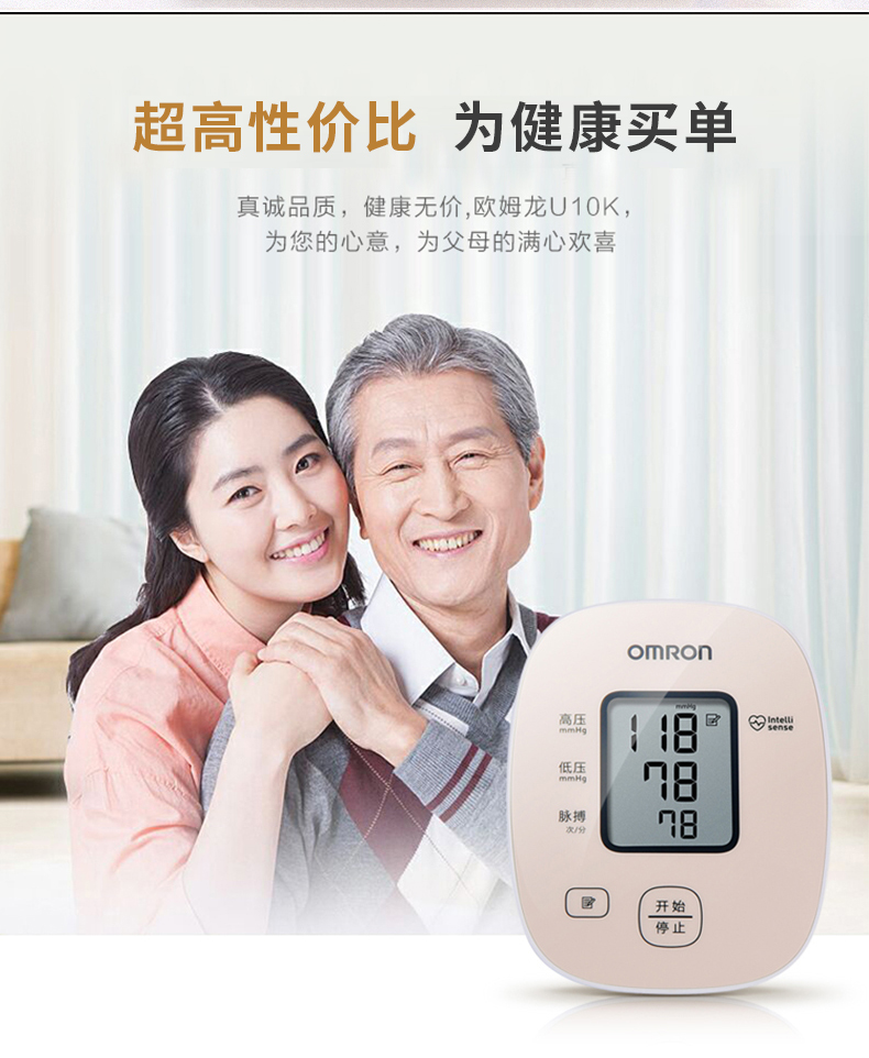 这款欧姆龙 U10K 上臂式电子血压计,是刚上市的新品,打破一惯的黑白灰三色设计,采用雅致的香槟金色,流畅的弧曲线设计,360°圆润造型,颜值更高。一键启动测压,使用非常简单,高清显示大屏显示。
