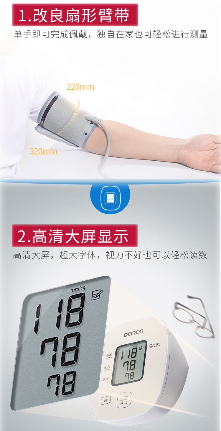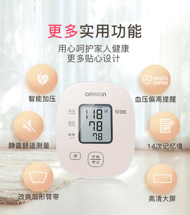 内置特有intellisense核心生物传感技术,根据被测量者的血压情况自动调节加压力度,实现缩短测量时间,搭配改良过的扇形臂带,提高测量舒适度,确保结果更加准确,最多记录14次记录数据,具备高血压自动警示功能;
