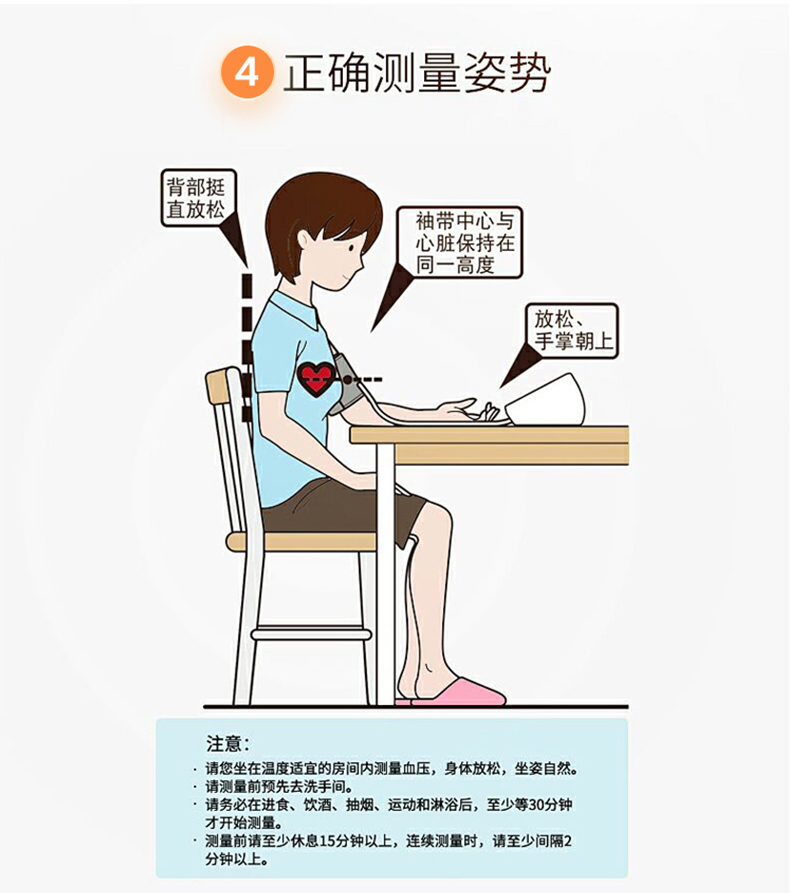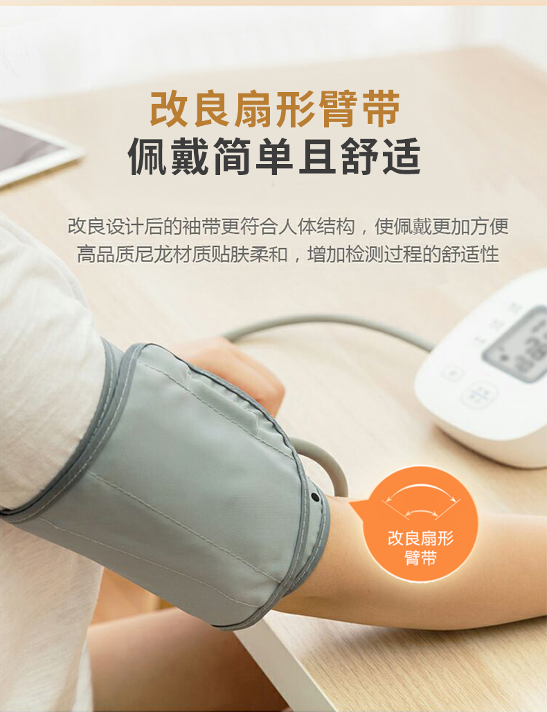 袖带自检,可以提示佩戴者佩戴的位置是否正确,提高检测的准确性;带有错误警示灯,在血压测量的过程中,略微的身体移动会造成错误血压值的产生,屏幕会显示误动作标志,重新测量后获得正常数值;血压计作为家中常备简易医疗设备之一,非常适合有老人的家庭使用。