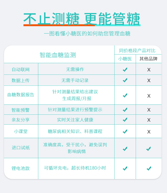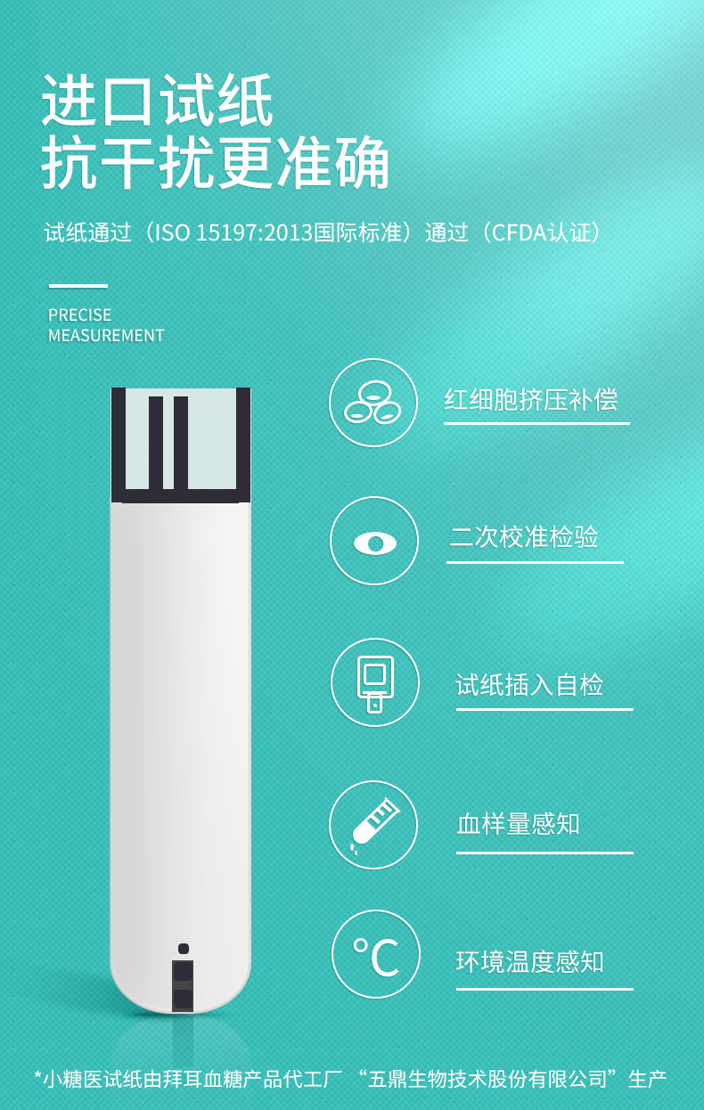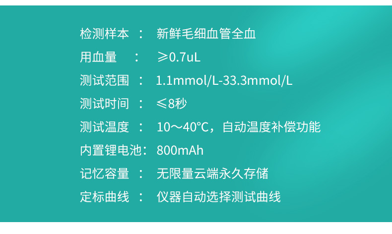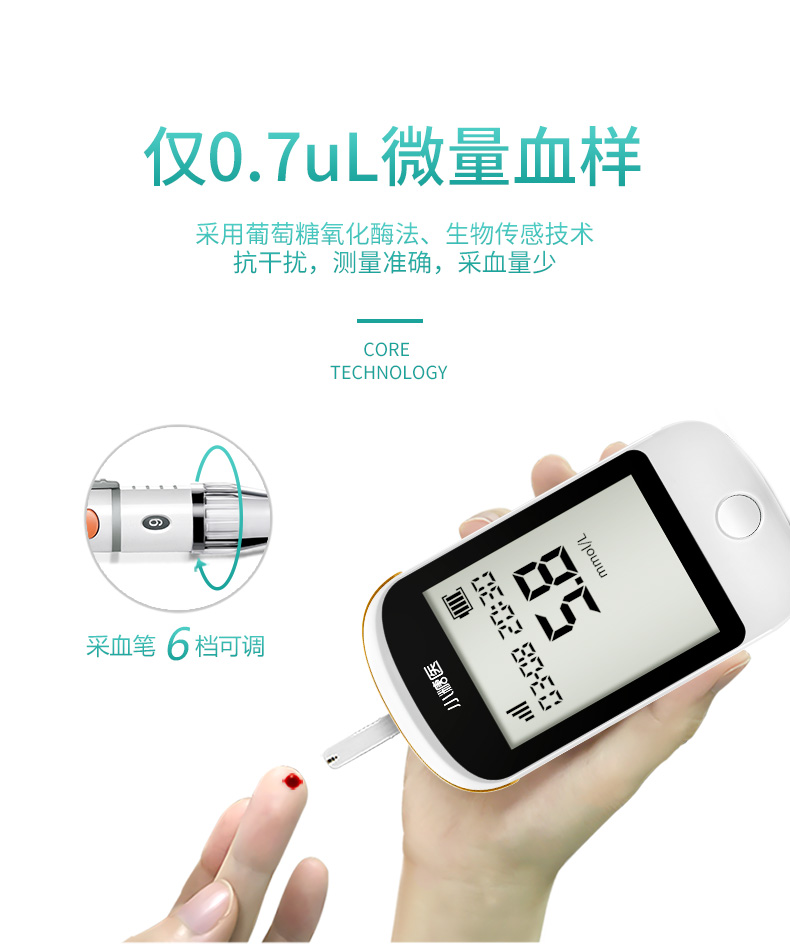 使用德国进口免调码四碳电极技术,抗干扰能力强,测量结果精准稳定。采用新型测量芯片,快速分析血液样本,只需5秒,即可准确出值