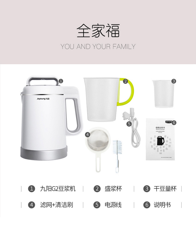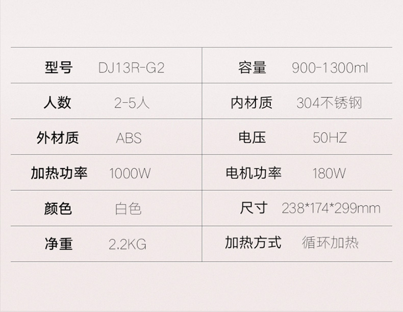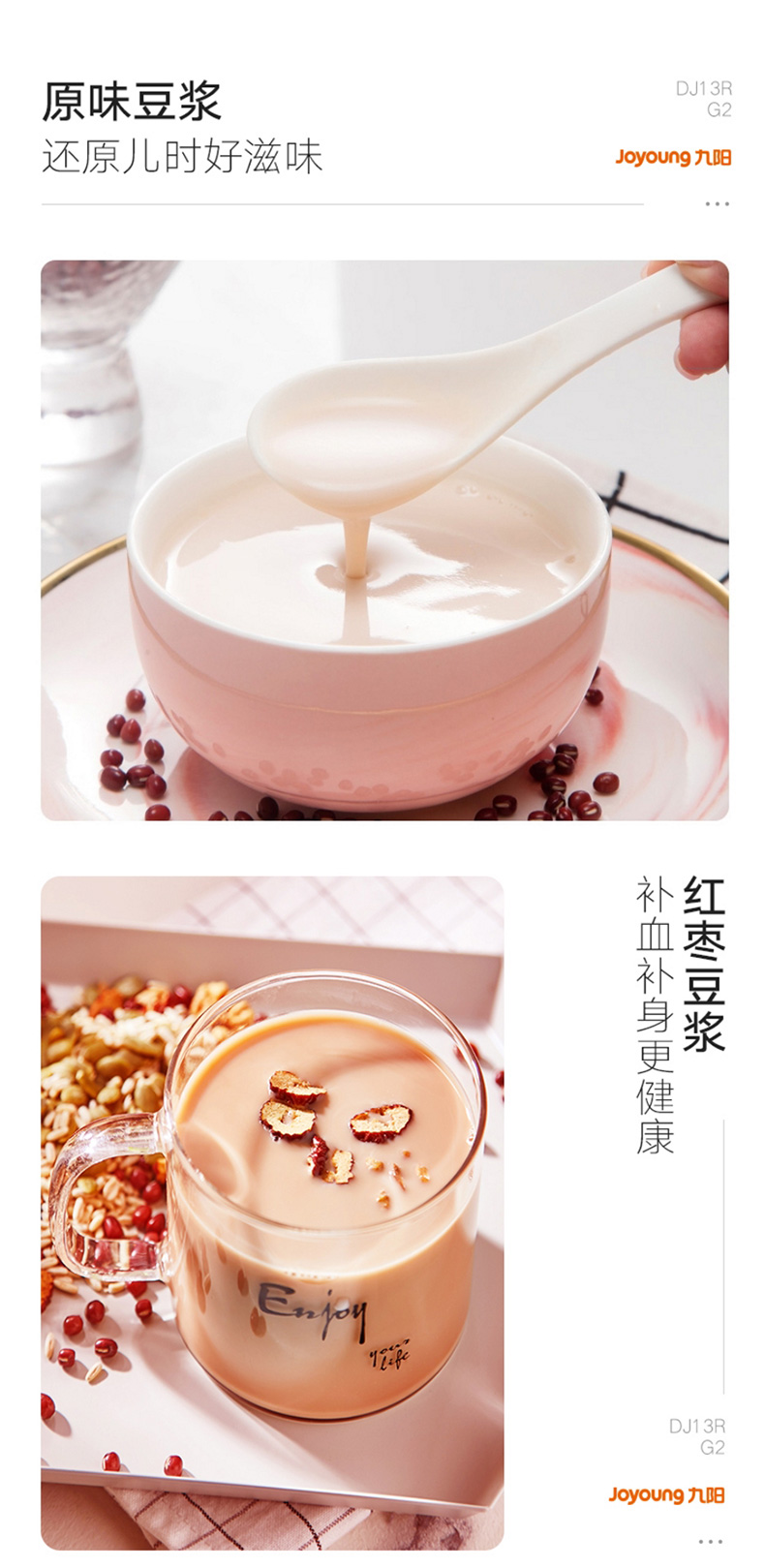 这款九阳 DJ13R-G2 豆浆机是2019年上市的豆浆机,容量是1.3L,不仅可以打豆浆,还能做枸杞浆、紫薯浆、米糊、果仁露、果蔬汁等,功能齐全,功率是1000W。