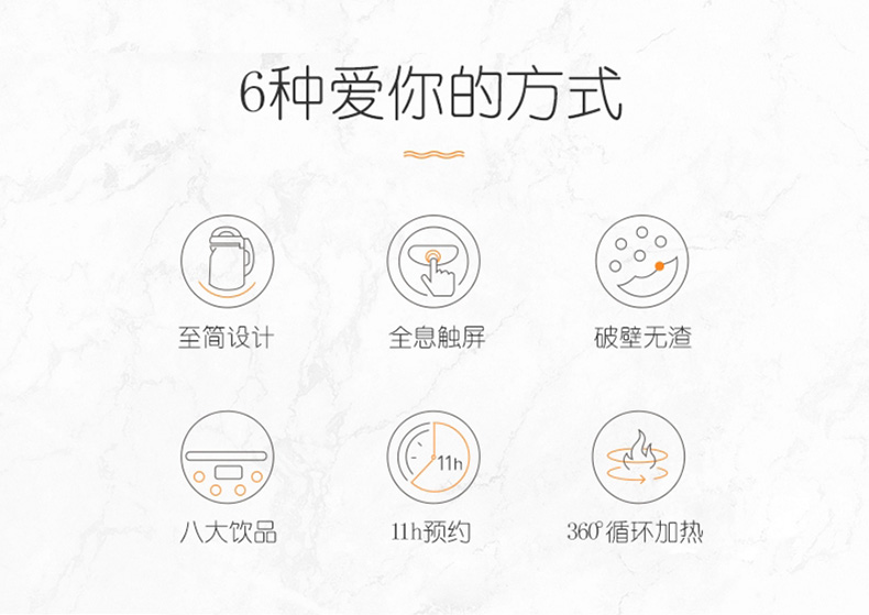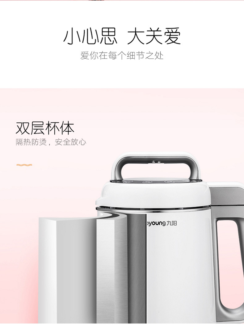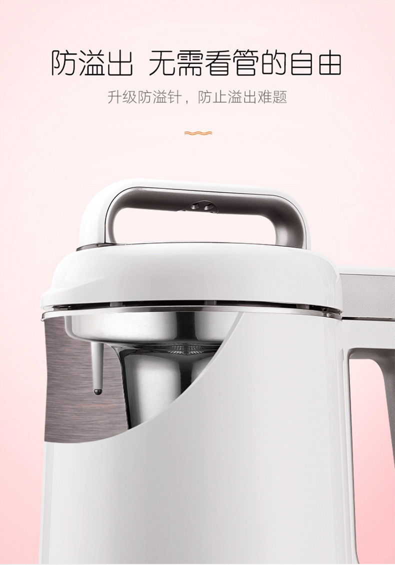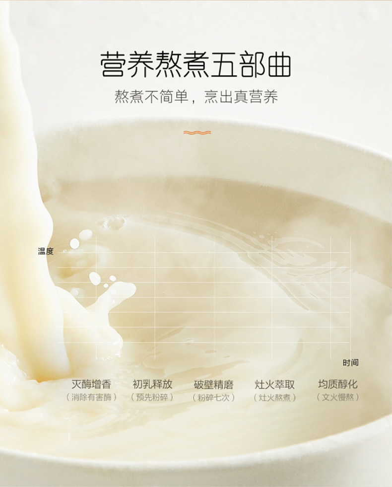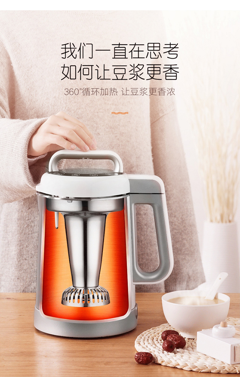 拥有智能熬煮程序,针对不同食材,采用不同的研磨时间、力度、熬煮时间、温度等,都有非常科学的规范,达到充分释放不同食材的营养;底侧立体加热,豆浆在制作过程中不糊底。