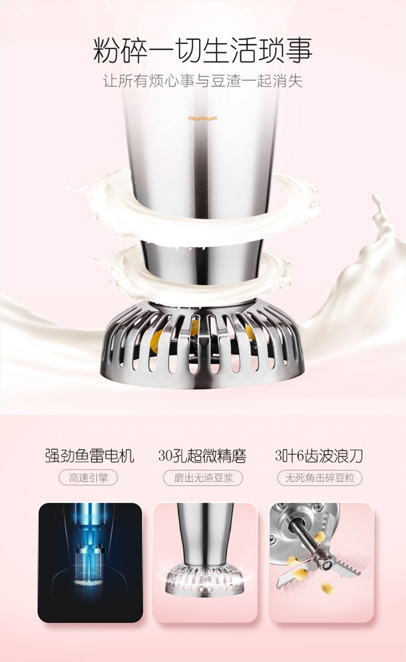 采用全新的破壁免滤3.0技术,用15000转/分的C8高速破壁电机配合30孔超微扰流研磨器和三叶双面精钢波浪刀片,使得豆浆在小空间内完成精细磨研磨的过程,最后是大吸力的精磨器,不停的吸取研磨,轻松实现免过滤的效果。