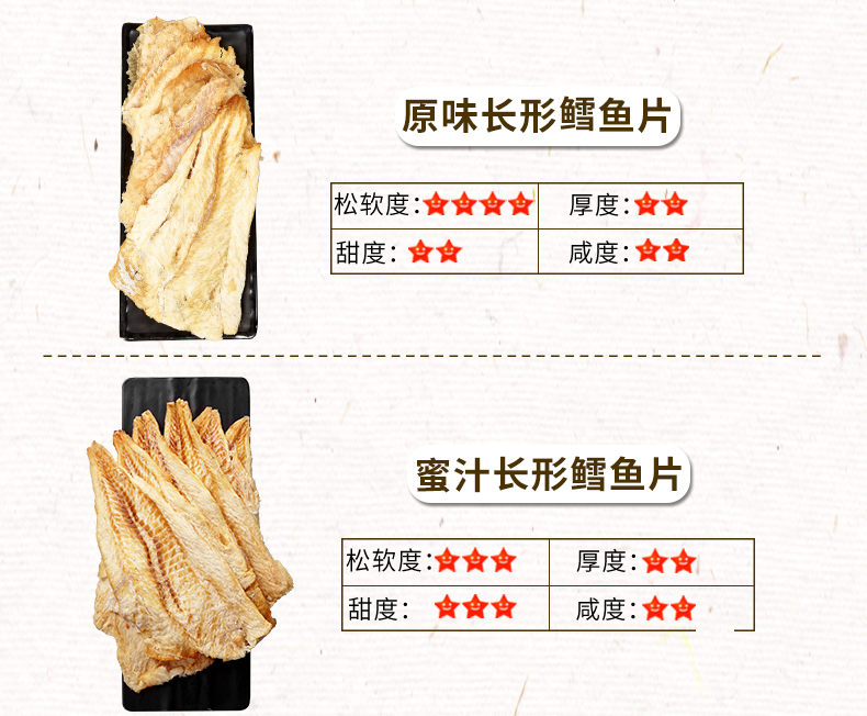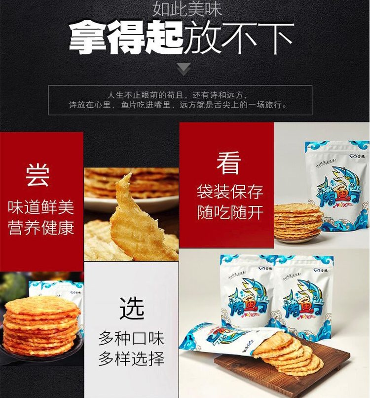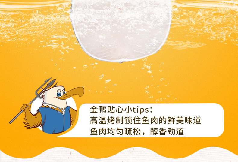 鳕鱼片色泽金黄,肉质肥厚,碳烤味浓郁,低脂肪高钙,鲜度极高,有着纯天然的细腻口感,甜、咸、鲜三位融合,蕴含其中,被誉为是餐桌上的“营养师” 。鳕鱼含有丰富的优质蛋白、EPA、DHA、多种微量元素以及多种维生素和不饱和脂肪酸等。