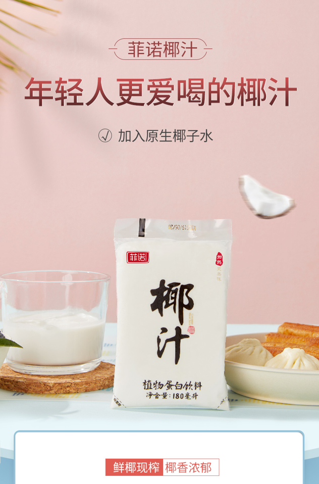 这款菲诺纯 生榨新鲜椰汁,规格:180ml*10袋,鲜椰现榨,加入原生椰子水,椰香浓郁;不添加香精、色素、防腐剂等,短保45天,确保椰汁新鲜;满口椰香,清甜不腻。