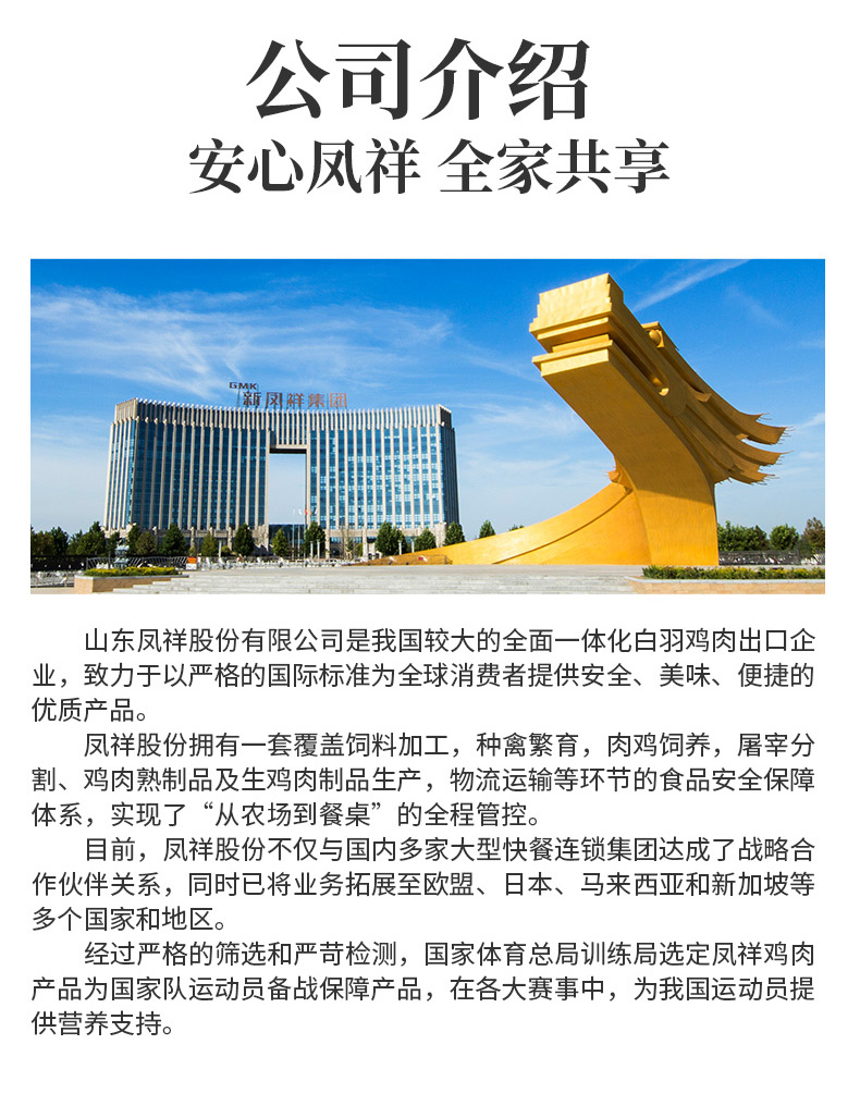 山东凤祥股份有限公司是中国最大的肉鸡生产加工出口企业之一,是农业产业化国家重点龙头企业、全国食品安全十强企业、伊斯兰教协会核准的清真食品定点加工企业。产品远销欧盟、日本、韩国、马来西亚等20个国家和地区。