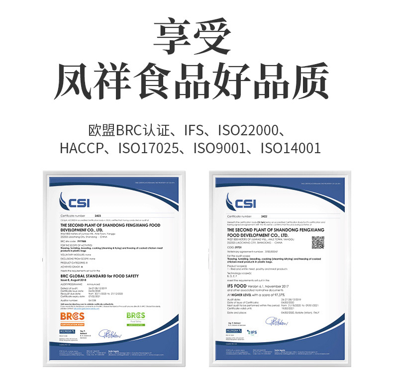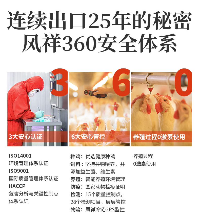 凤祥是肯德基、麦当劳等连锁集团的战略供应商,同时也是国家队运动员的备战保障产品。坚持内外销“同线同标同质”,严格按照国际标准质量管理体系,实现了质量可追溯。通过自养自宰一体化经营,构建了“从农场到餐桌”全产业链的食品安全体系。