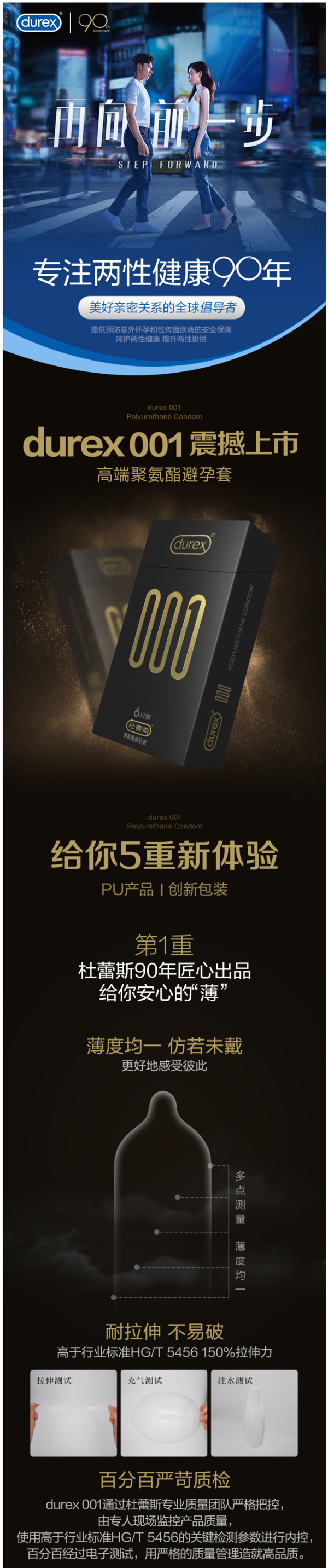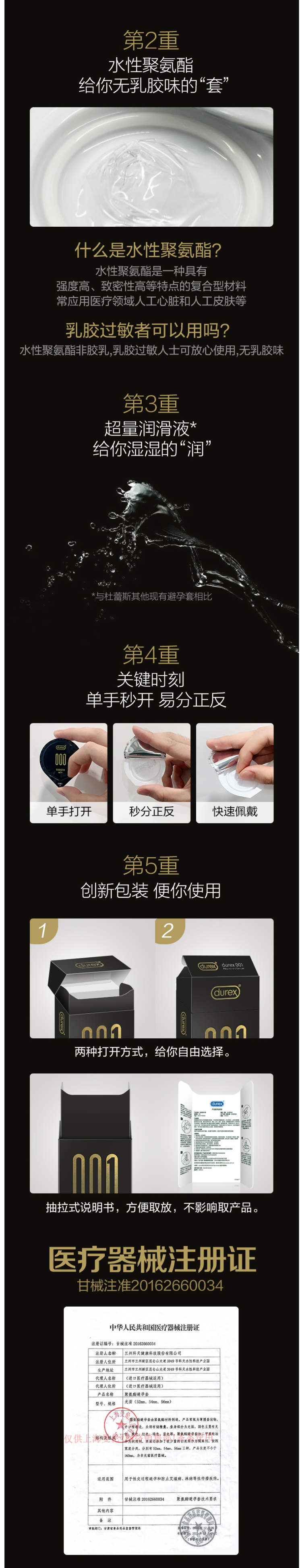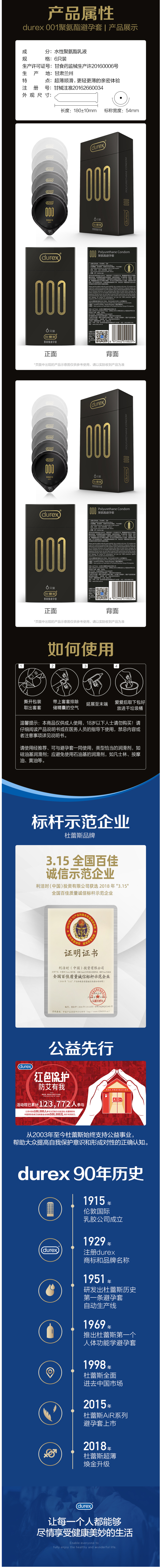 这款杜蕾斯001避孕套是旗下最薄的避孕套,号称是“000”,有着仿若未戴的超薄感受,关键是薄度均一,耐拉伸不易破,高于行业标准HG/T 5456 150%拉伸力。