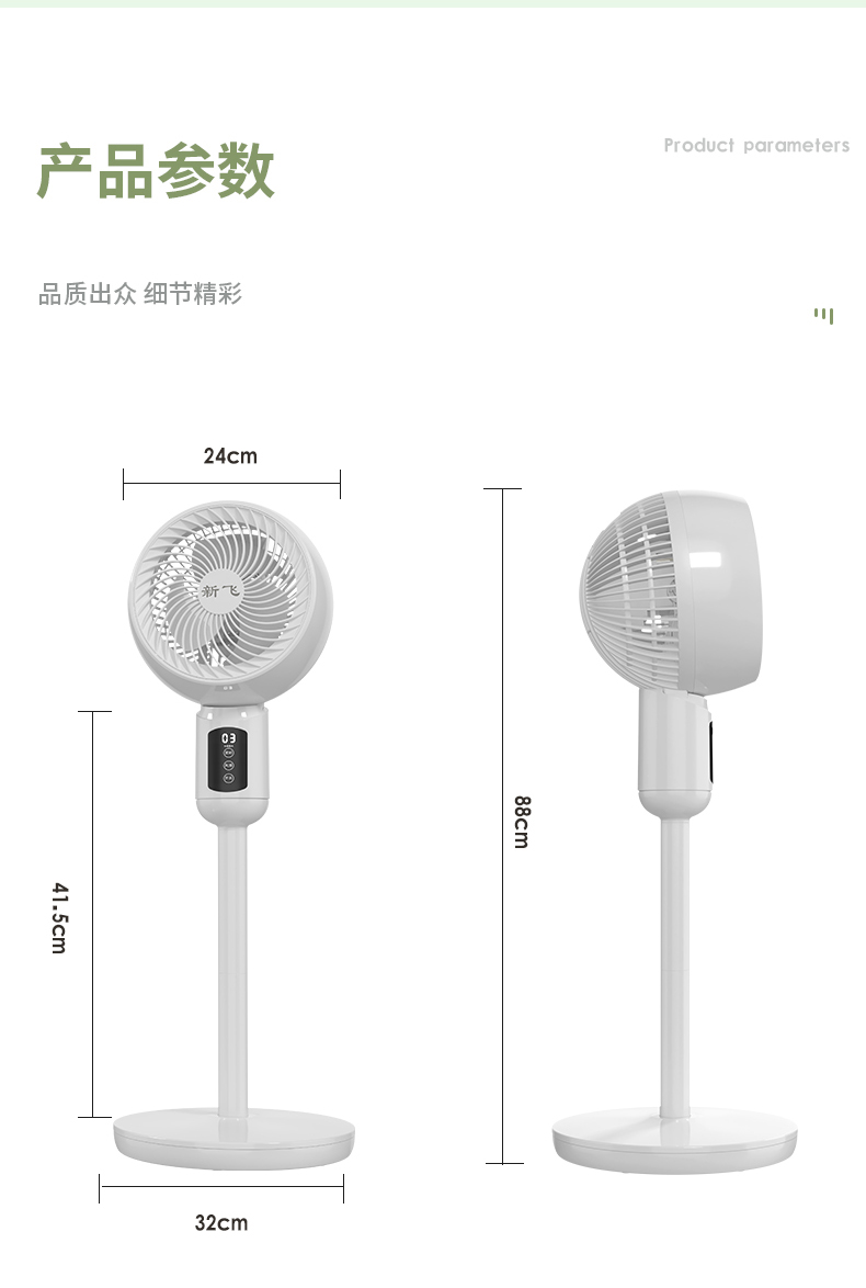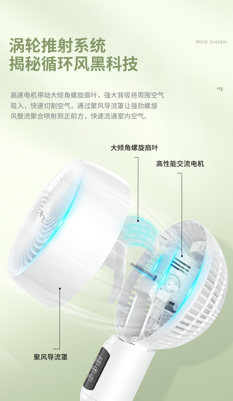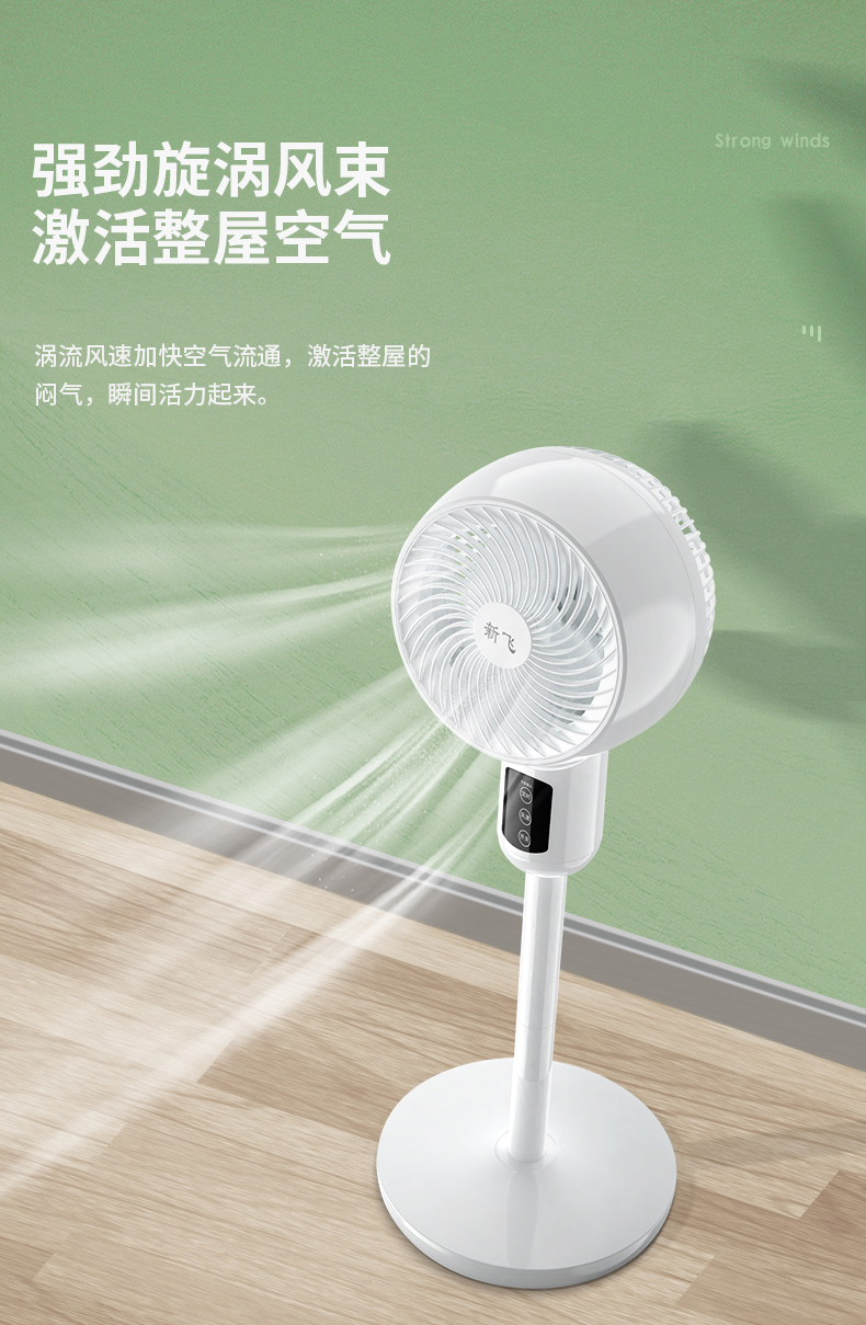内置高性能涡轮电机,45W额定功率,噪音低动力强,省电节能。通过大倾角螺旋扇叶和聚风导流罩形成强劲涡流风束,可带动整屋空气循环。三档风力可控,广角摇头送风,配合空调使用均匀分布冷气,调高制冷效率。