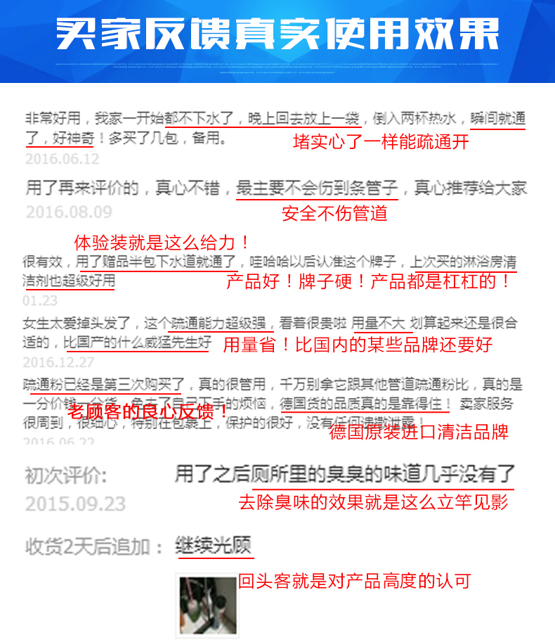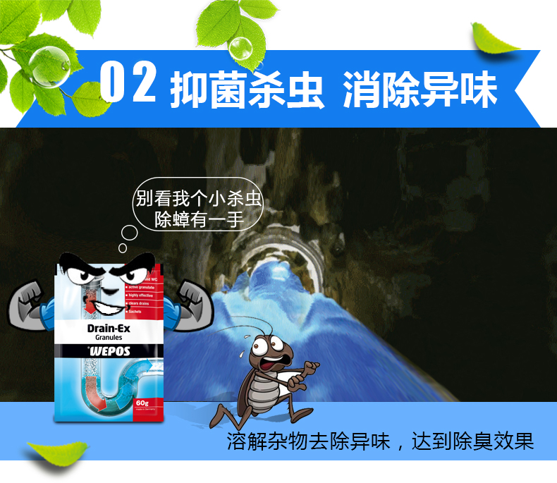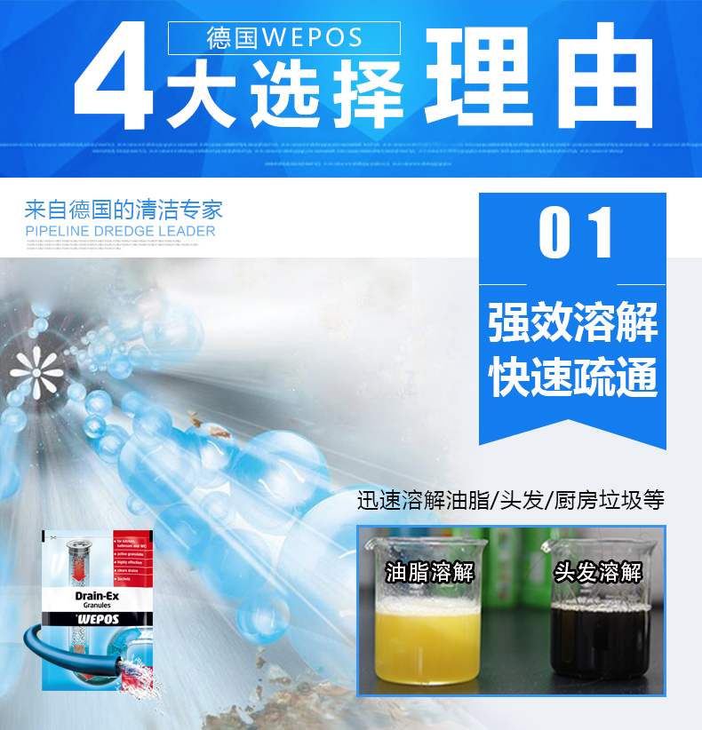 这款WEPOS管道疏通剂,德国原装进口,无刺激性气味,可有效溶解管道中的头发、食物残渣、油脂等物质,适用于洗手盆、洗菜池、浴盆、地漏和马桶等处,无残留,不凝结,不伤管道。溶解疏通外还可有效抑菌杀虫,消除异味,产品安全,即使家中有母婴人群亦可使用。