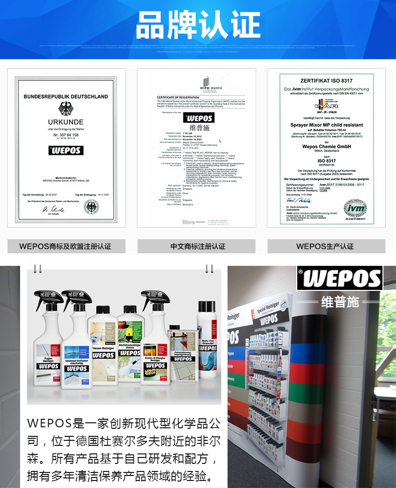 维普施(WEPOS)公司位于杜塞尔多夫附近的菲尔森,产品主要用来对房屋内的装饰、用品、厨卫设施等进行特种清洁和养护。产品线涵盖防水防潮、除霉防霉、木器清洁护理、瓷砖石材清洁护理、厨具灶具清洁护理等家居生活的方方面面。