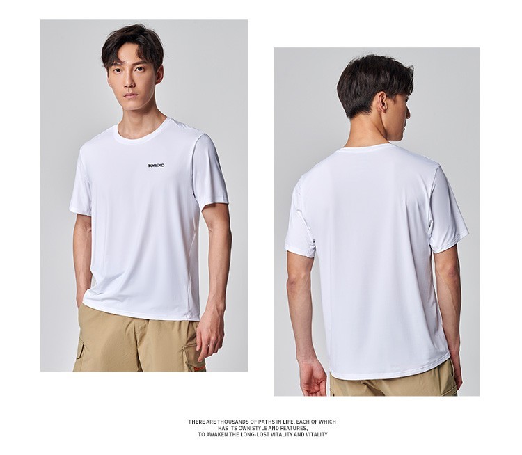 这款探路者男运动T恤是2020年的春夏款,使用锦纶+聚酯+氨纶的混纺速干面料,在瞬间接触皮肤时有明显凉感,有良好的的吸湿排汗功能,能将身体汗液排出体外,保持运动时身体舒爽不粘腻。