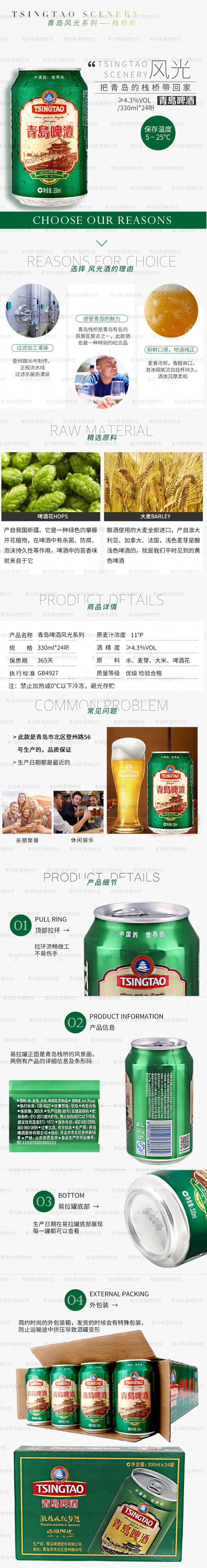 选用进口优质大麦、大米、上等啤酒花和软硬适度、洁净甘美的崂山矿泉水为原料酿制而成。原麦汁浓度为11度,酒精含量4.3%。酒液清澈透明、呈淡黄色,泡沫细腻洁白、麦香浓郁,酒体沉厚柔和,香醇爽口。