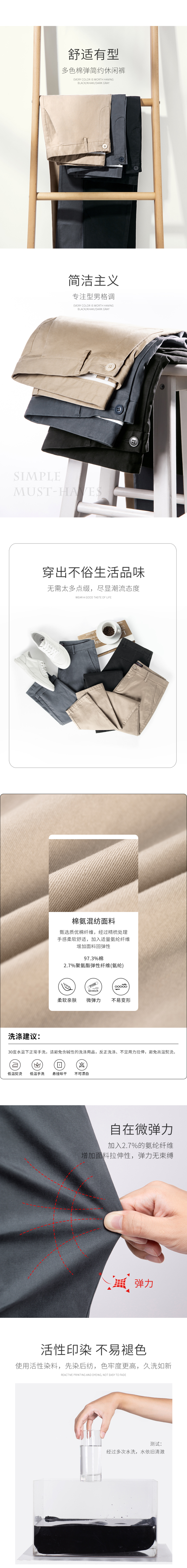 97.3%棉+2.7%氨纶混纺面料,棉纤维经过精梳处理,剔除短纤维和杂质,手感顺滑,柔软舒适,面料微弹力,上身不束缚,不易褶皱,水洗不变形,立体的剪裁,拉长腿部线条感,更修身帅气,春夏百搭时尚。