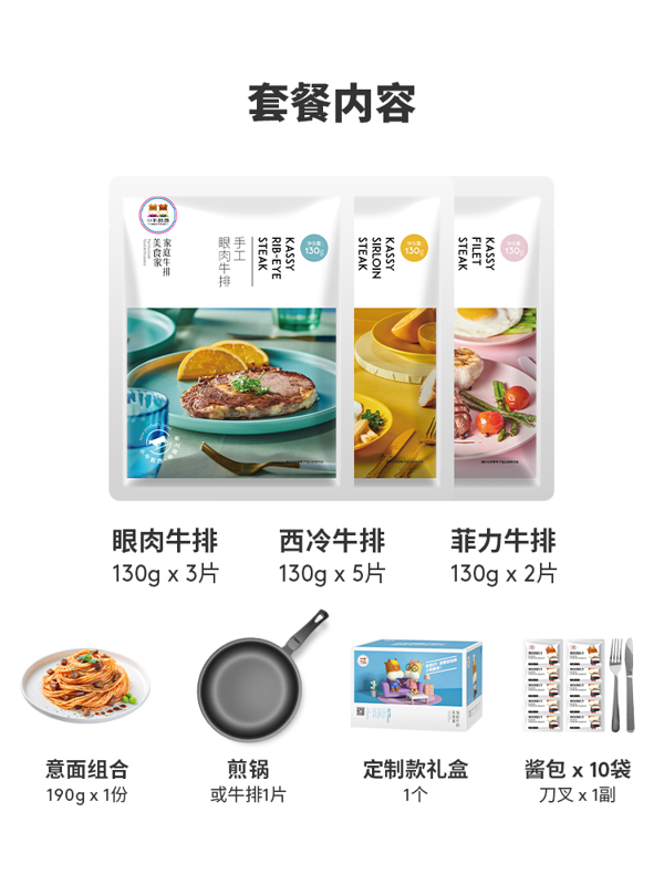 天猫小牛凯西旗舰店198元,可领50元优惠券,实付148元到手,赠品不要煎锅可以换牛排。这款小牛凯西 原切牛排套餐,累计有29万的4.8分好评,套餐包括:眼肉牛排 130g*3、西冷牛排 130g*5、菲力牛排 130g*2,赠意面190g+煎锅+酱包*10+刀叉*1。