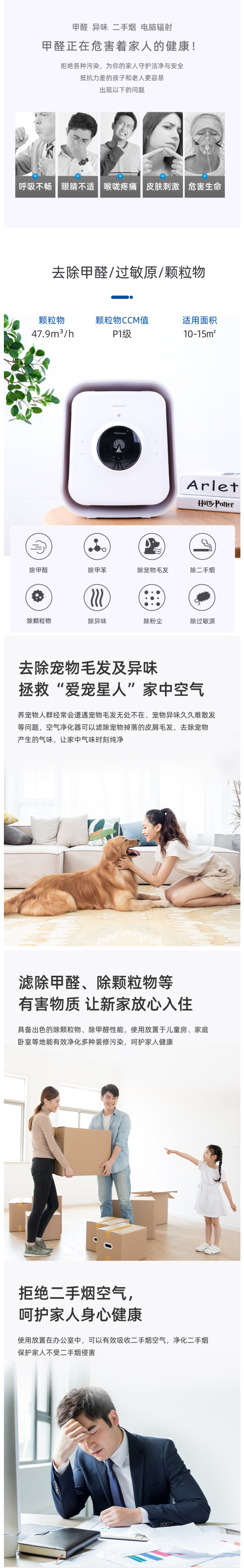 这款Treenovo小型桌面空气净化器,无叶风扇型,内置了HEPA+活性炭复合滤网(初效滤网+活动炭网),能净化甲醛、过敏源和颗粒物、二手烟和异味。