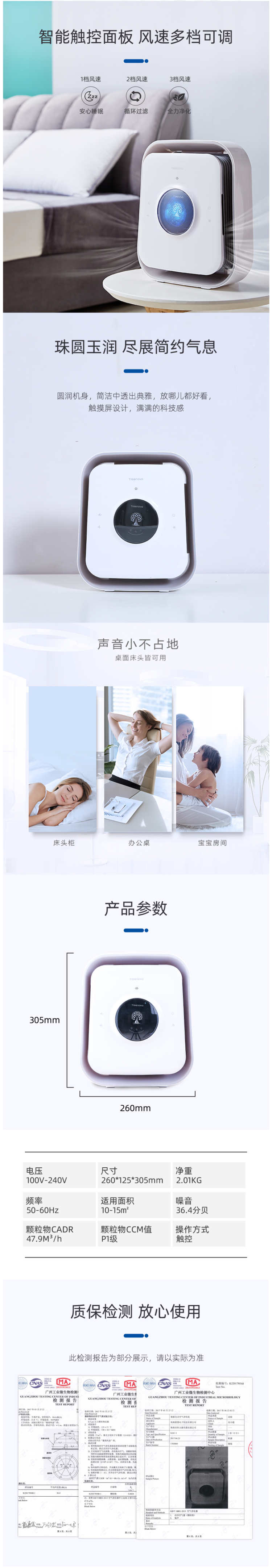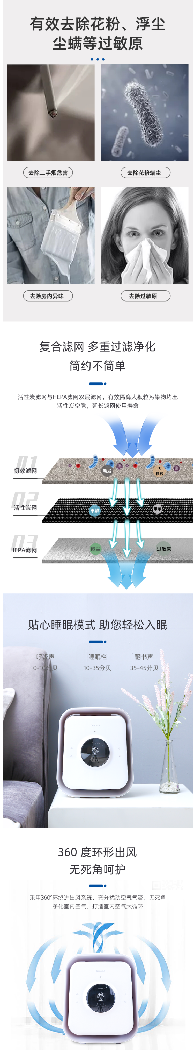 采用360°环绕进出风系统,充分扰动空气气流,无死角净化室内空气。智能触控面板,三档风速可调,1档安心睡眠、2档循环过滤、3档全力净化。