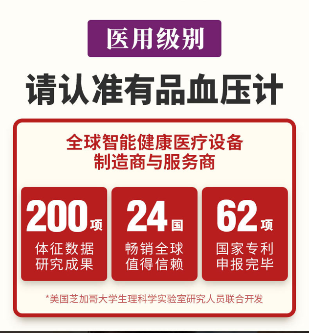 这款血压仪是医用级,测量高精准,智能充压自动测量,免脱测量,冬天使用更方便。内置升级核心传感器,可同时测量血压、脉搏,可分开双人测量。
