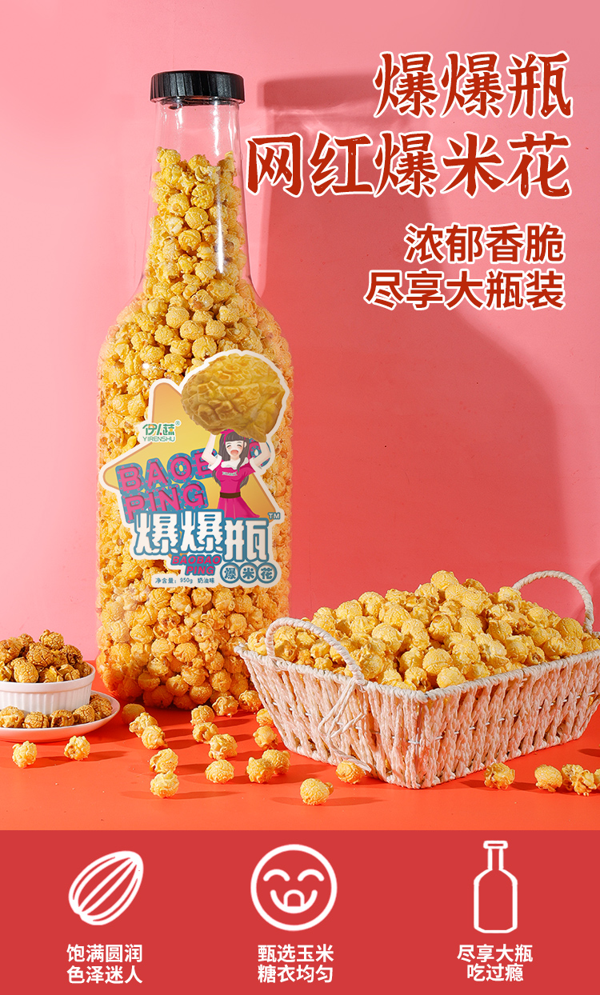 这款网红爆爆瓶爆米花,选用非转基因玉米为原料,搭配棕榈油、优质白砂糖、焦糖,球形玉米粒形状,色泽金黄、颗颗饱满,味道均匀覆盖,口感上粒粒爆到酥脆,不使用人造糖精而是天然焦糖,味虽浓郁但不腻人。