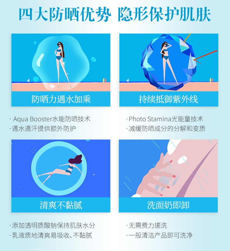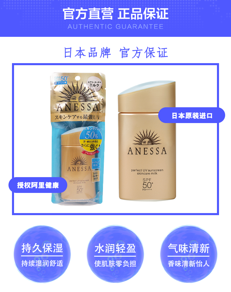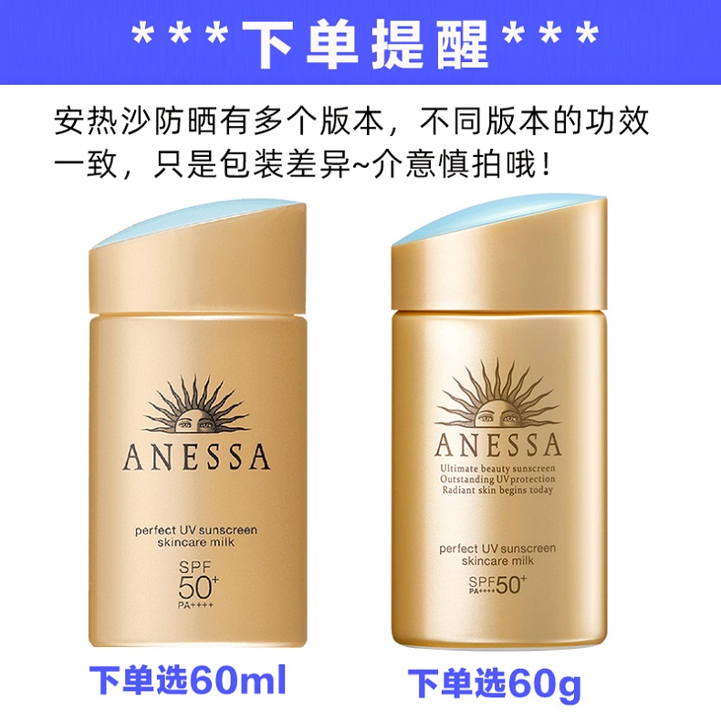 这款安热沙ANESSA蓝帽小金瓶防晒霜,日本原装进口,SPF50+,这是目前最高的防晒等级,升级水能防晒技术,防水防汗,清爽不黏腻,适合户外运动、去海边度假、海里浮潜时使用,全身都能涂抹。
