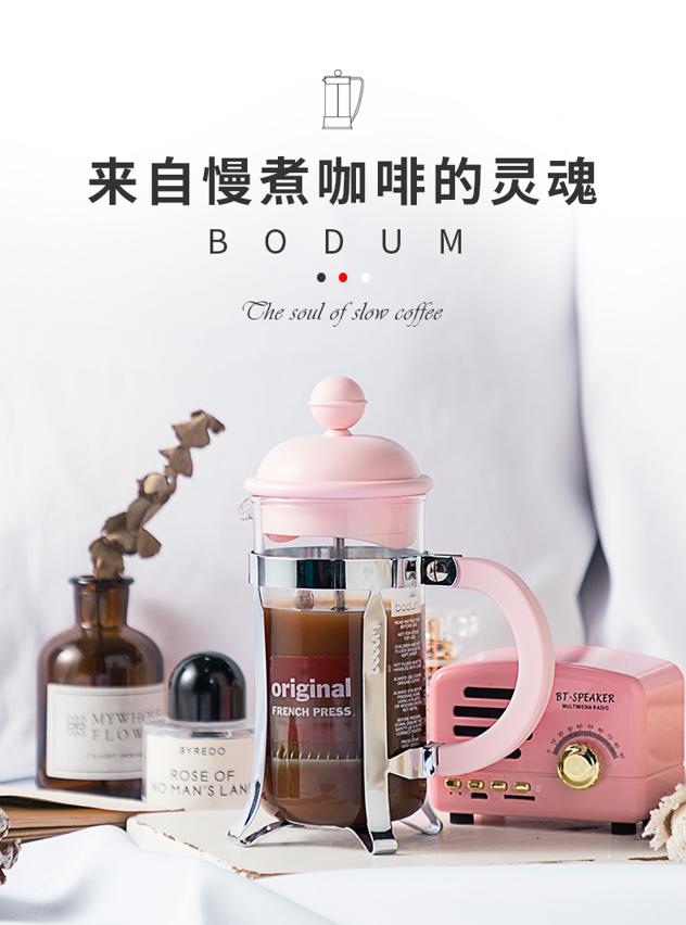 Bodum(波顿)1944年创立于丹麦,数十年来一贯以简约单纯的基本款造型、贴心实用的机能考虑、轻盈耐用的材质、与十分平民化的亲和价格著称于世。其最最经典的商品--已成为今日重要咖啡冲泡工具之一的滤压式咖啡壶. 从此令冲煮咖啡变成只要轻轻松松两三动作便可完成的工作;至今已成欧美地区居家咖啡的主流冲泡法之一,也使bodum几乎成为滤压式咖啡壶的代名词。