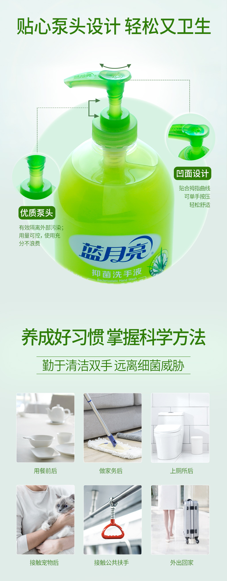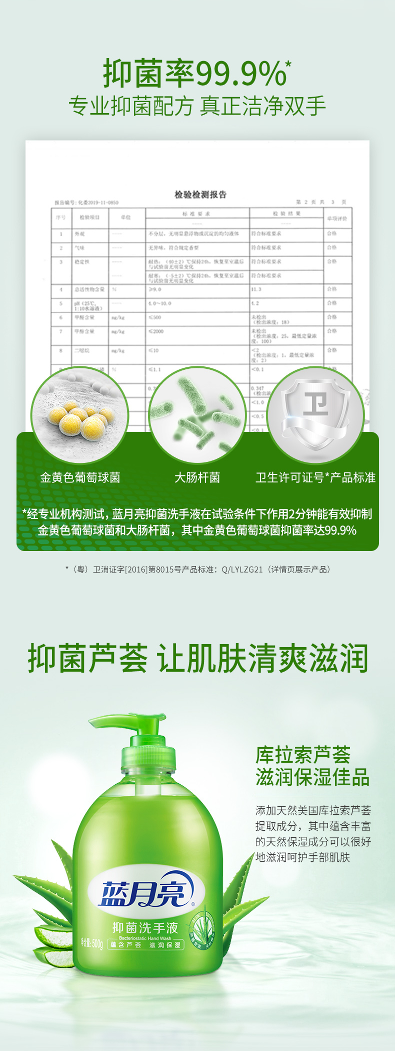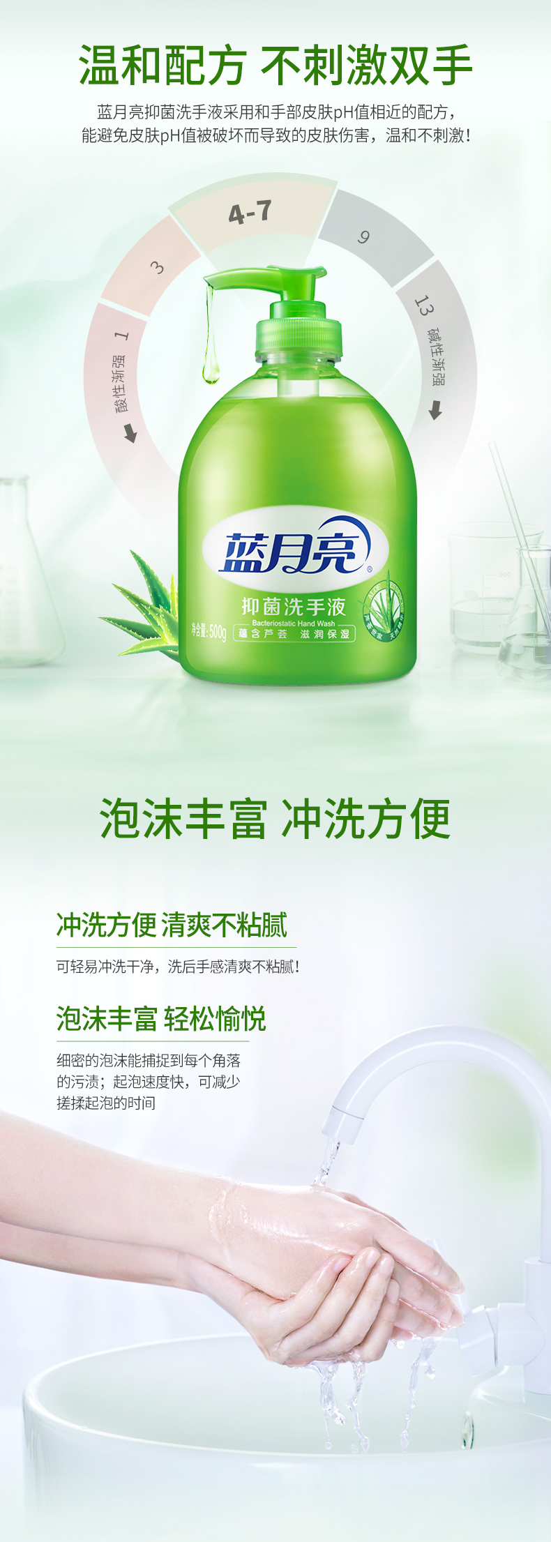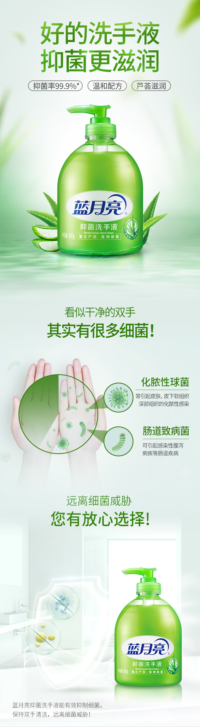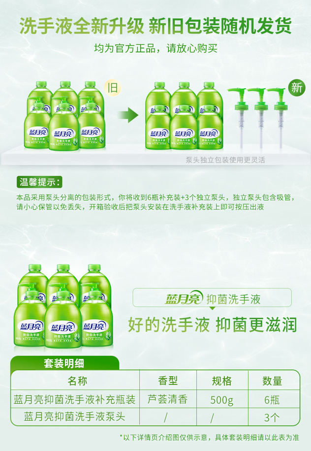 这款蓝月亮 芦荟味抑菌消毒洗手液,特含芦荟抑菌成分,有效抑制细菌滋生,保持双手清洁;洗手液的PH值和皮肤的PH值接近,温和不刺激,不伤手。